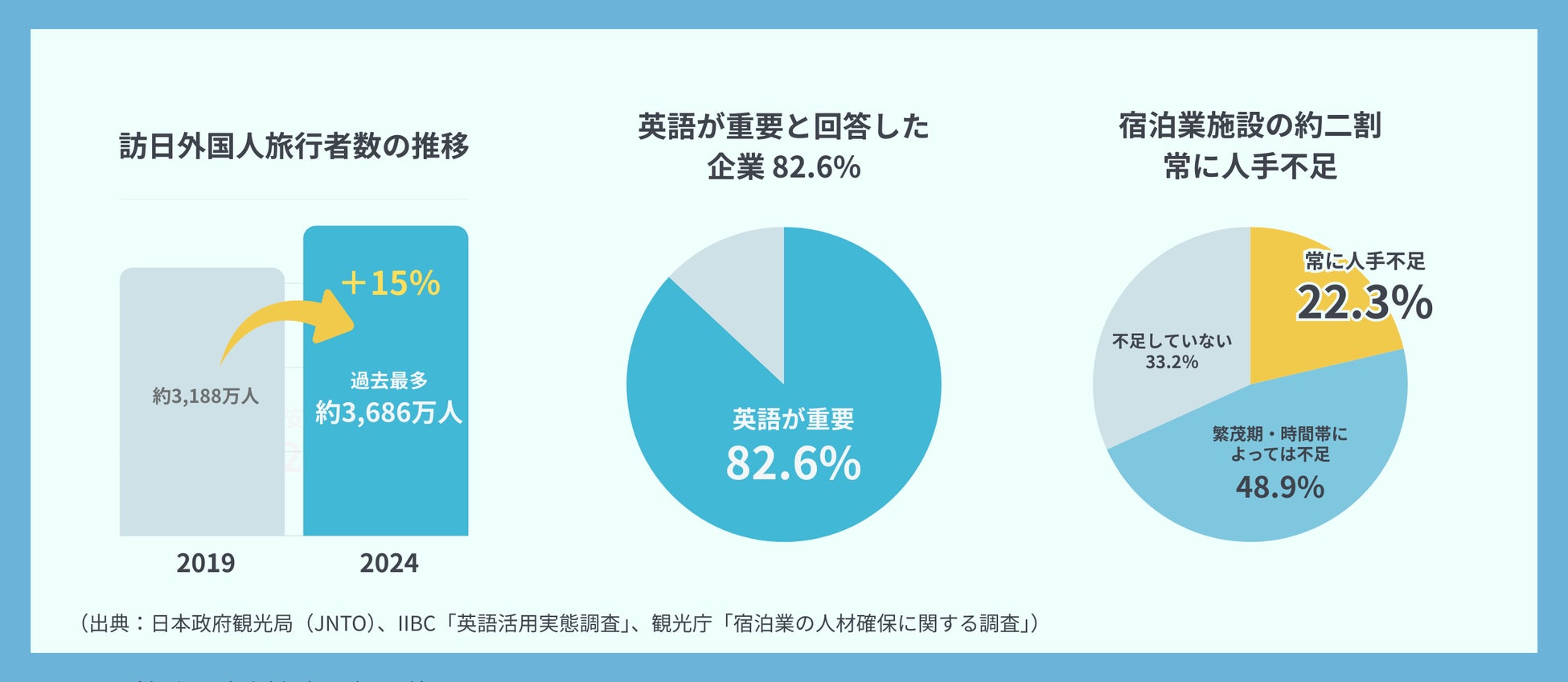 一方で企業側でも、グローバル対応人材への需要は高まっています。調査では、英語を重要スキルと捉える企業・団体が82.6%にのぼり、67.0%が今後の強化が必要と回答しています。さらにインバウンドは2024年に年間3,686万人(過去最高)まで回復し 、観光の受け皿となる宿泊業では人手不足が顕著で、常に人手不足とする施設も約2割存在します。その結果、インバウンド・観光・海外営業・グローバル人材領域において、即戦力人材の確保が大きな課題となっています。(出典:日本政府観光局、観光庁、IIBC)
