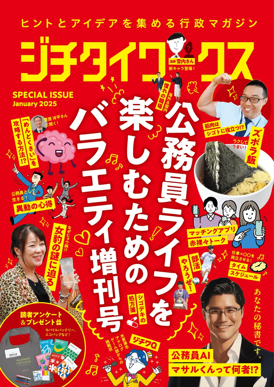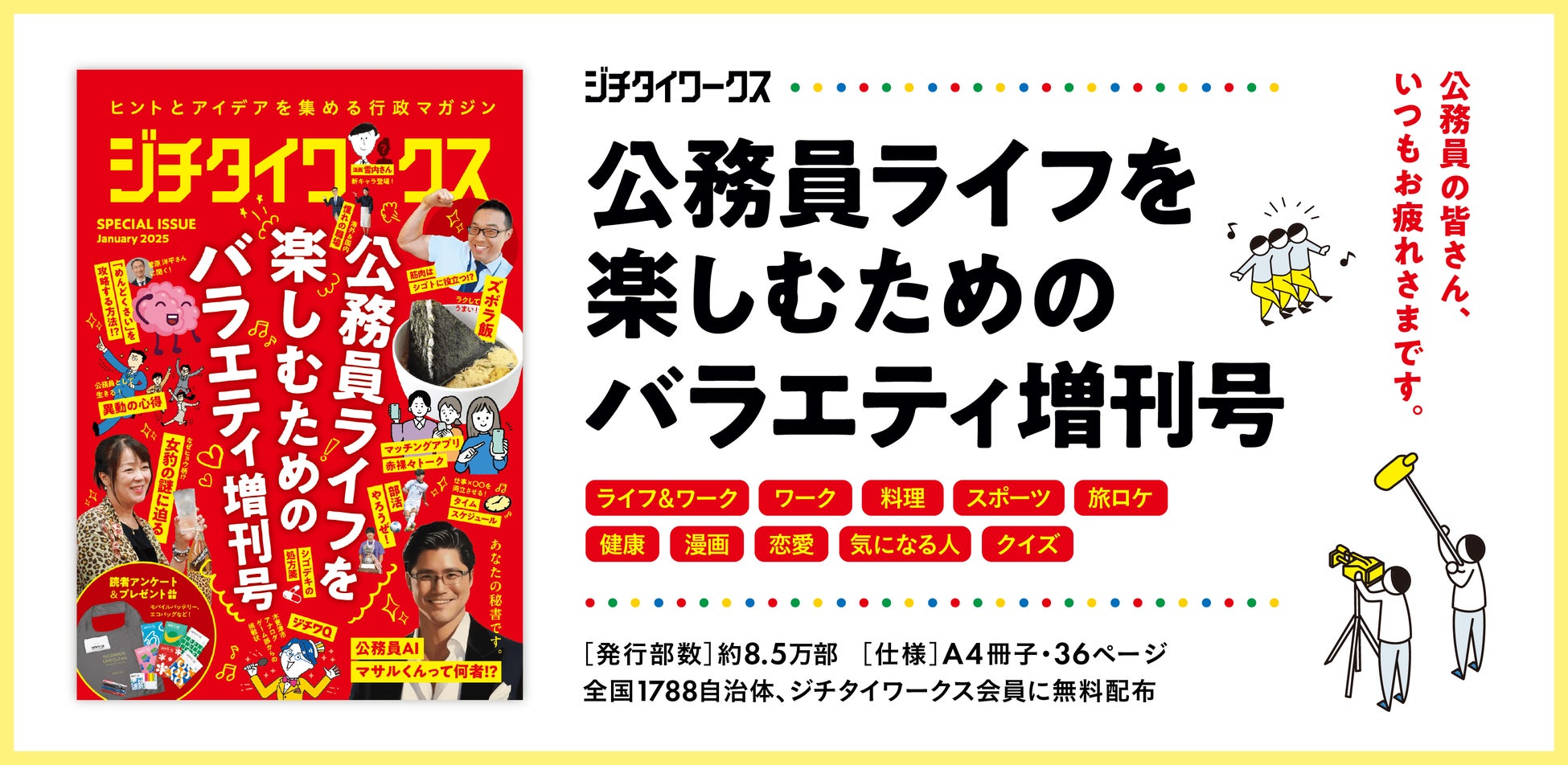 創刊より全国の自治体の様々な取り組み事例を届けている『ジチタイワークス』ですが、取材で知る自治体業務の幅広さと、公務員の皆様の熱量には驚きを隠せません。そこで今回は、日々社会の課題に立ち向かい頑張る公務員の皆様に少しの安らぎの時間を提供したいと考え、「公務員ライフを楽しむためのバラエティ増刊号」を発刊いたしました。「クスっと笑える」「ほう!と気づきを得る」など、まるでバラエティ番組のように楽しめる、自治体・公務員にまつわる多彩なコンテンツを詰め合わせています。堅苦しさは抜きにして、疲れた心と頭を休めながらも、公務員ライフを楽しく、豊かに感じられるような1冊になっております。なお、今回の増刊号は、全国1,788の自治体で働く職員の皆様、ジチタイワークス会員が配布対象になります。