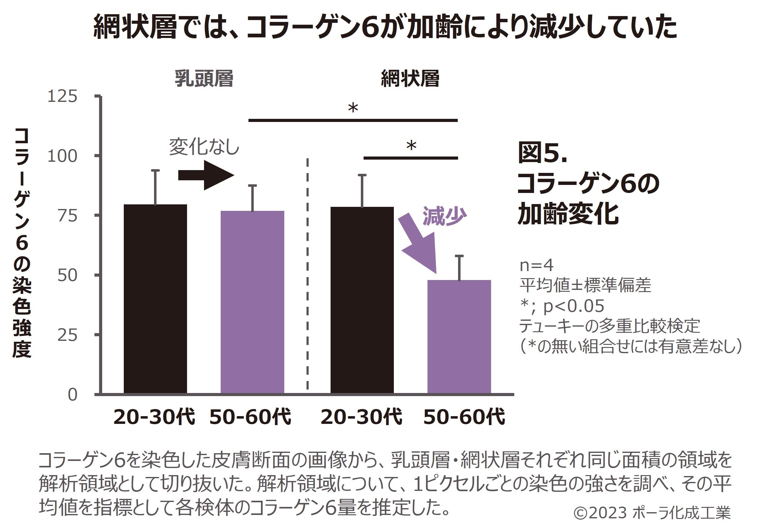図1のような、コラーゲン6を染色した皮膚組織の画像を用いて20~30代と50~60代のコラーゲン6の量を数値化し比べました。 解析の結果、乳頭層では年代間で違いが認められなかったのに対して、網状層では20~30代に比べて50~60代ではコラーゲン6が少なくなっていることが分かり、数値の上でも加齢による変化が捉えられました(図5)。