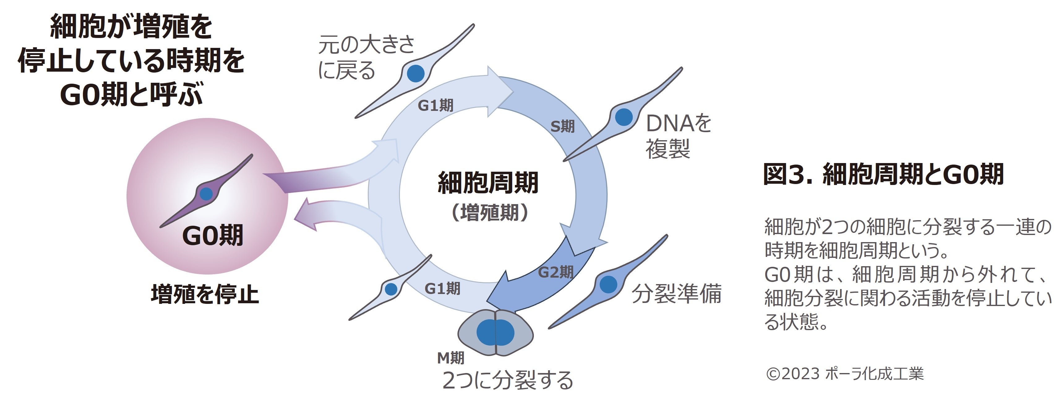 細胞には、分裂して増殖する細胞周期と呼ばれる状態(G1期、S期、G2期、M期からなる)と、増殖を停止しているG0期と呼ばれる状態が存在します(図3)。