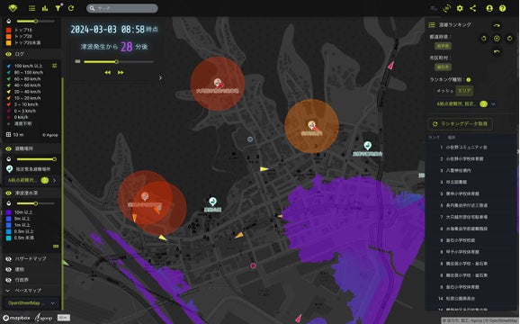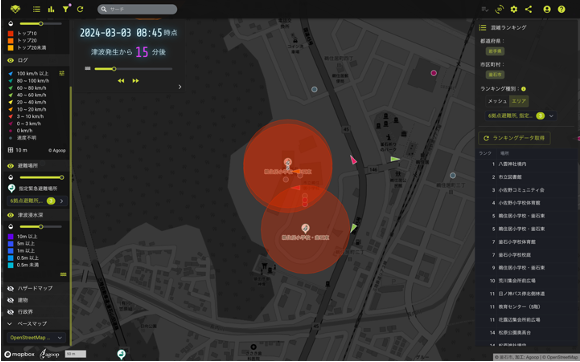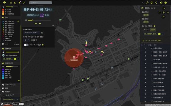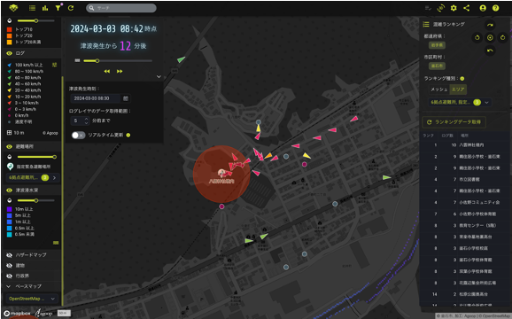 地震による津波災害を想定した避難訓練実施時に、指定緊急避難場所や指定避難所、それら以外の地域への避難状況を、あらかじめ避難訓練実施地域の住民へ配布したスマホアプリ「アルコイン」を通して、位置情報の収集について同意を得たユーザーから収集した人流データをリアルタイム人流可視化ソリューションで可視化し、災害対策本部に設置されたモニターに投影して分析しました。