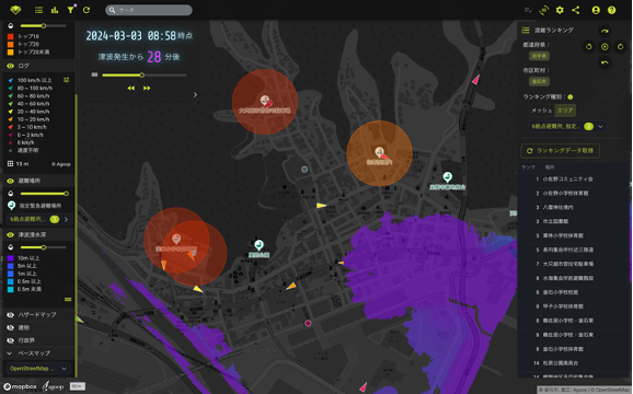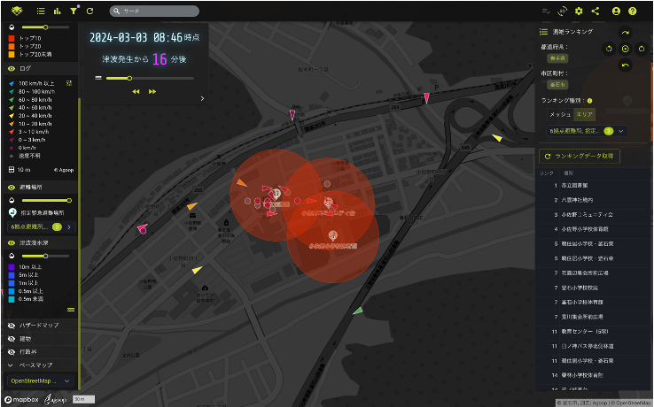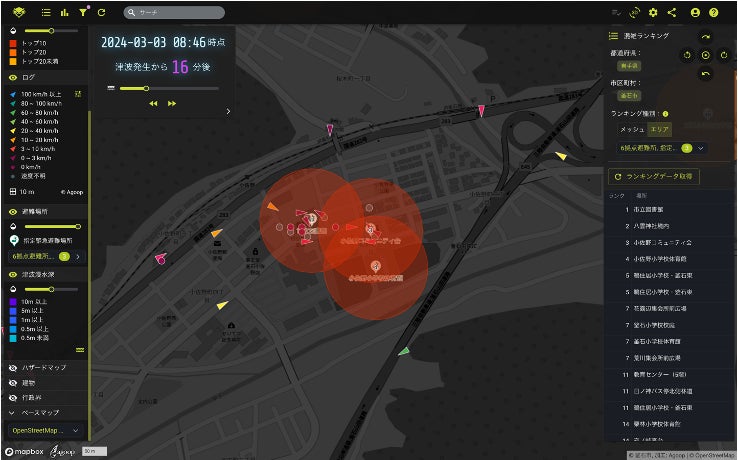 - リアルタイム分析とは、位置情報の収集について同意を得たユーザーから収集した人流データを地図画面上に表示し、どの方向へ、どれくらいの速さで移動しているかを確認できる仕組みです。最大津波浸水エリアや、指定避難所の情報を重ねて可視化することができ、避難者の行動を把握・分析できる機能です。