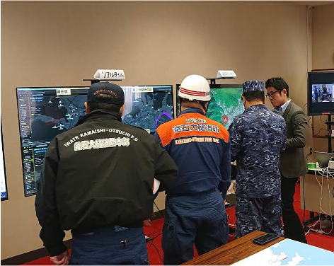 <リアルタイム分析で避難者の行動を見る釜石市の小野共市長(中央)>