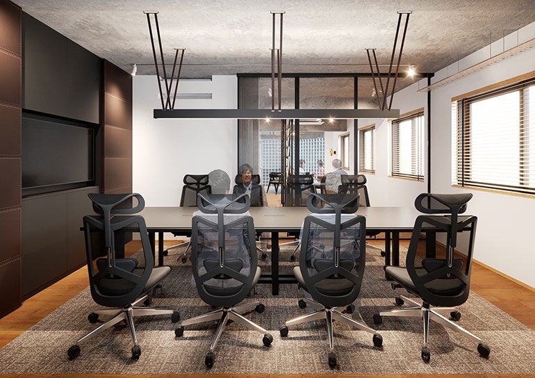 新旧の対比で魅せるデザインを踏襲しつつ、ブラックとレザーのコントラストが落ち着いた雰囲気を演出します。外部からの来客や、プレゼンテーション、会議等のフォーマルなミーティングの対応も想定しています。