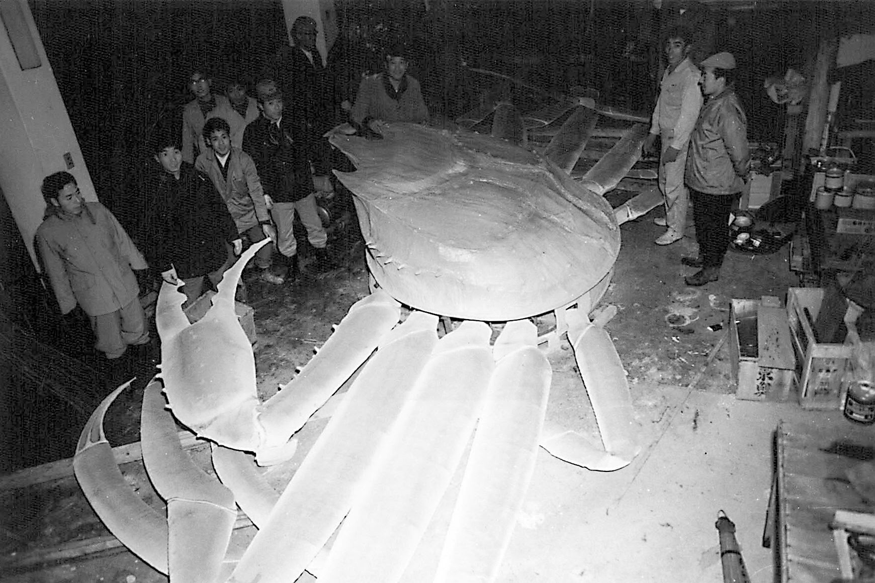 初代かに看板は、太い針金をまいた骨組みに麻袋を張り合わせ着色に使ったペンキで防水を兼ね、爪や脚を動かすのに5つのモーターを使って製作し、1962年の開店から1971年まで10年間、働いていました。