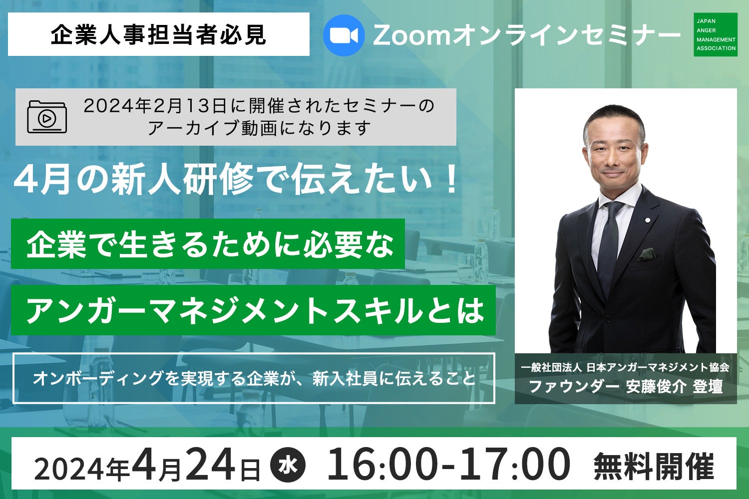 【企業人事担当者必見】4月24日(水)、当協会ファウンダー安藤俊介登壇の大好評セミナー「4月の新人研修で伝えたい!企業で生きるために必要なアンガーマネジメントスキル」アーカイブ動画配信決定!