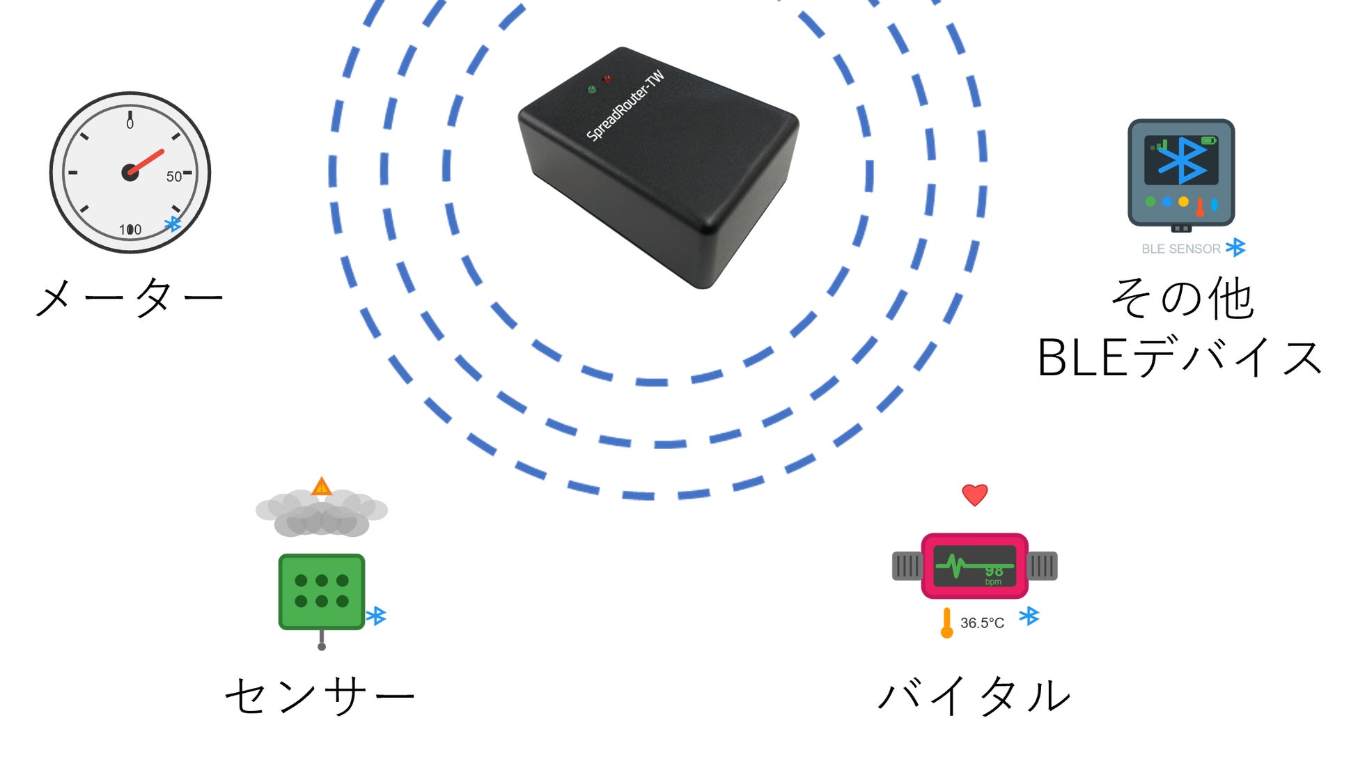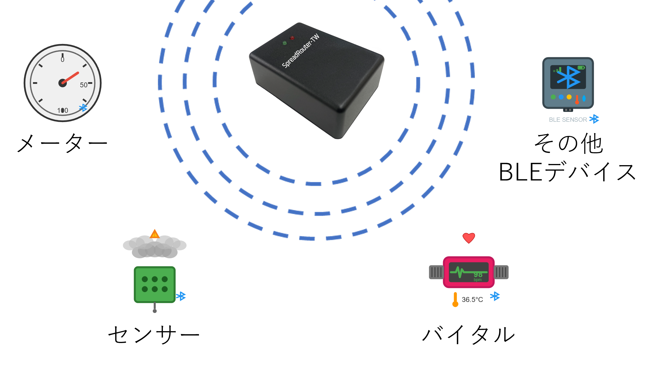 特定メーカーに縛られず、市販のBLEセンサー(温度・湿度・ガス検知等)を自由に選択可能。既存デバイスも活用でき、初期投資を抑制できます。