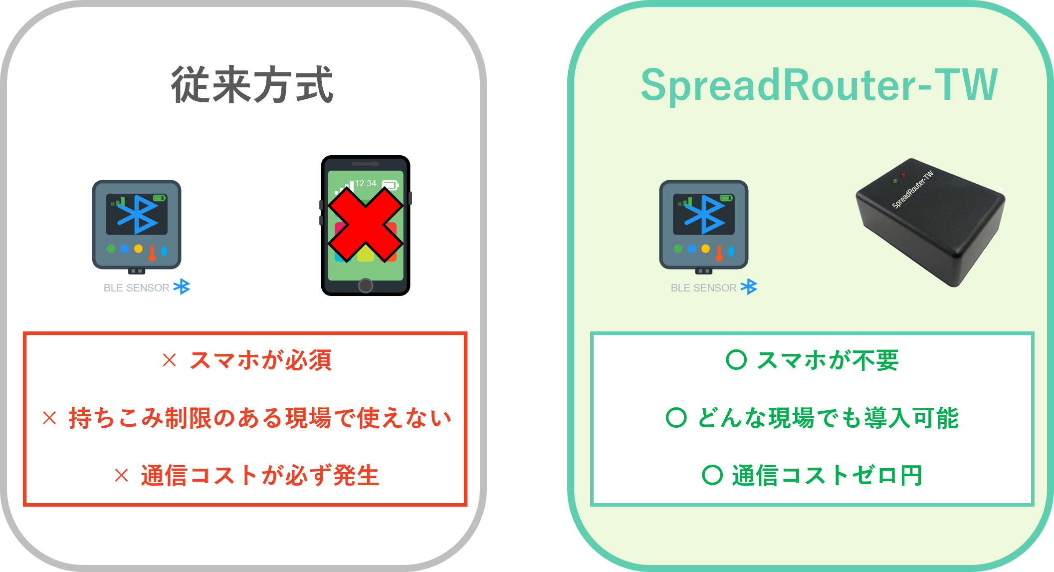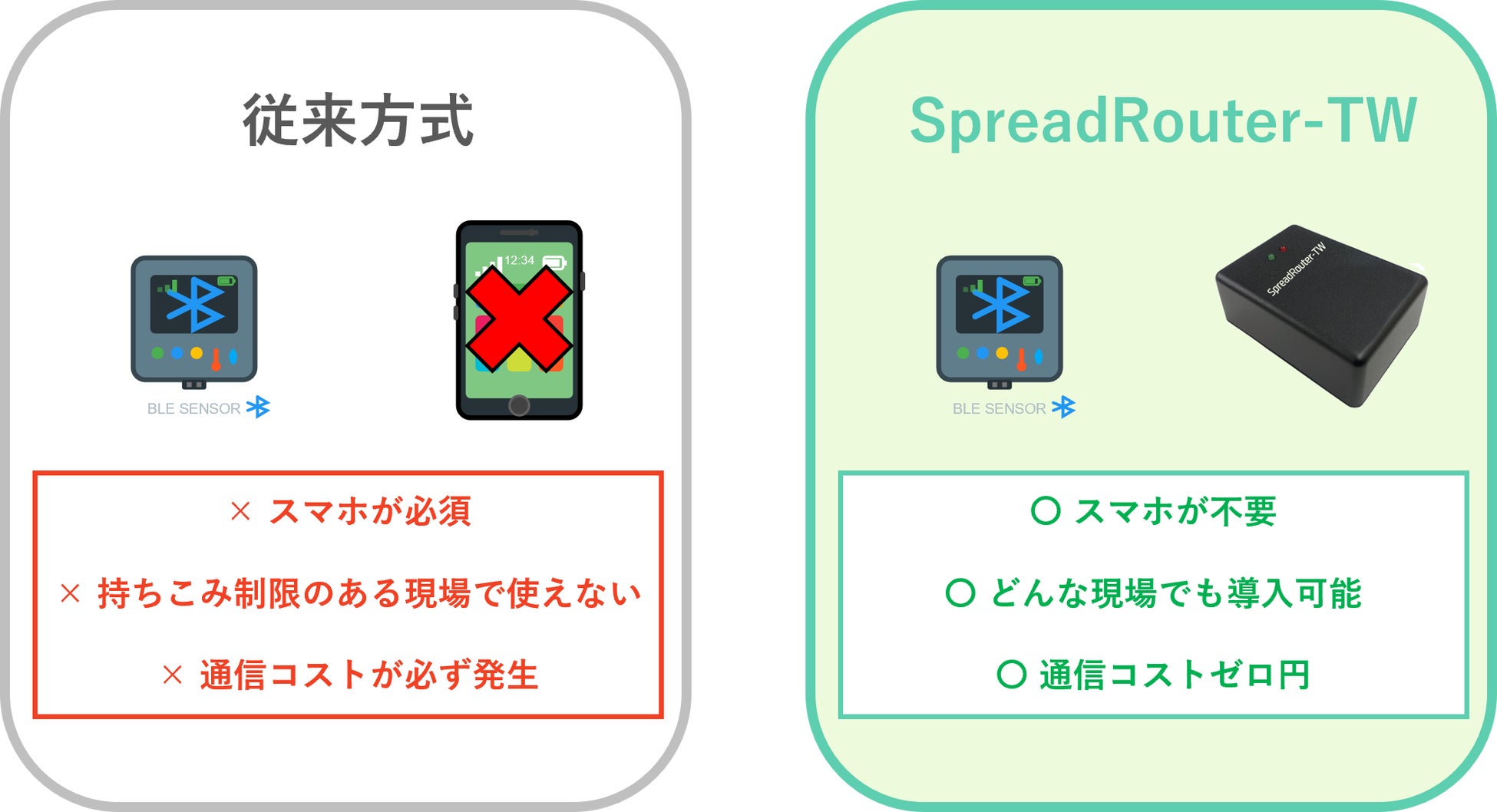 近年、安価で省電力なBLEセンサーが市場に多数登場していますが、近距離通信のためスマートフォン経由でのデータ取得が必要で遠隔監視に不向きという課題がありました。また、トンネル工事現場や山間部などLTE電波が届かない場所では現場に足を運ぶ必要があり、作業者の安全管理も困難でした。さらに、スマートフォン経由では通信コストが重荷となり、特定メーカーのシステムに依存せざるを得ないという課題もありました。