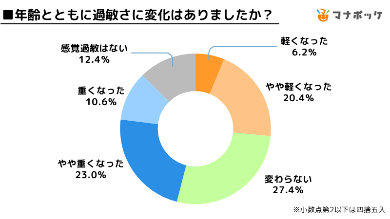 「変わらない」が27.4%、「やや重くなった」が23.0%、「やや軽くなった」が20.4%とあまり大きな差は見られない結果となりました。年齢による過敏さの変化には個人差があるようです。