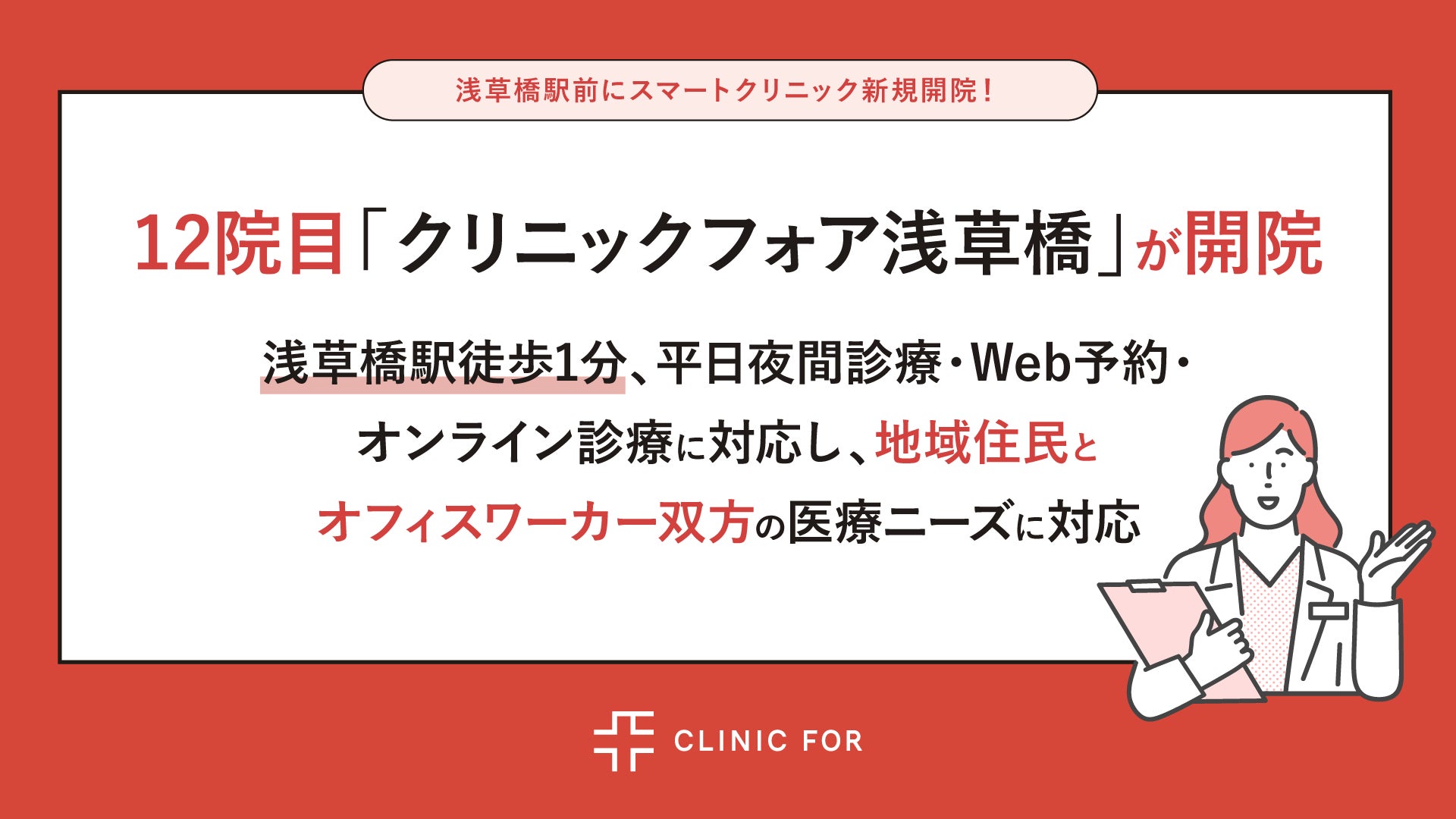 対面診療とオンライン診療を提供するクリニックフォアグループ(以下、クリニックフォア)は、2025年4月1日、12院目となる新クリニック「クリニックフォア浅草橋」を開院いたしました。