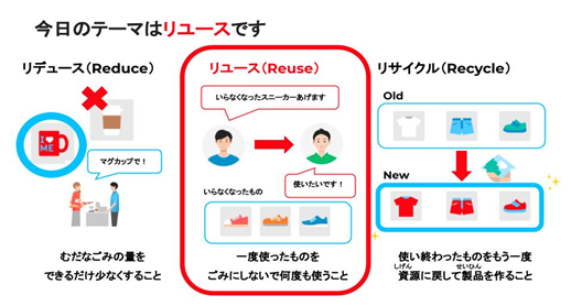 ス、リユース、リサイクル)についてあらためて確認するとともに、「リユース」に焦点を当て、リユースにはどのような方法があるのか、またどのようなものがリユースできるのかについて、主体的に考えるグループワークなどを行いました。