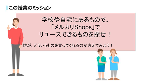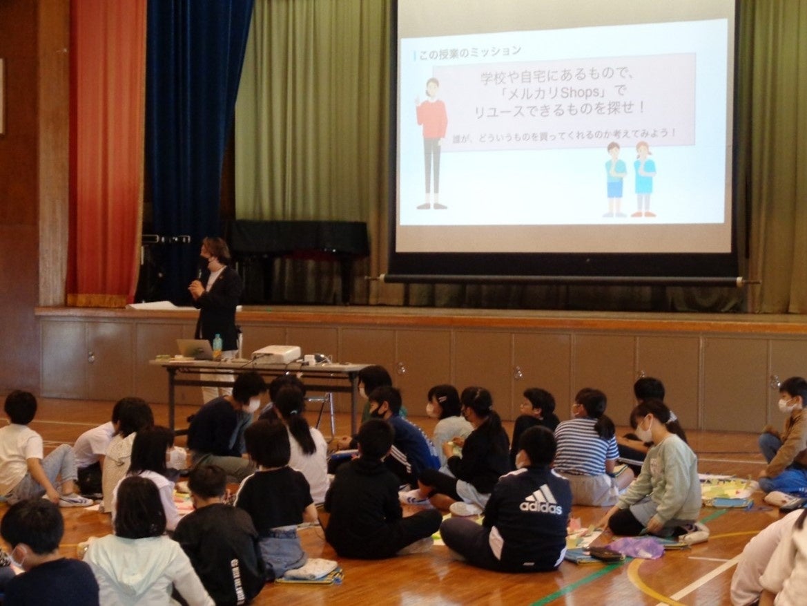 【内容】フリマアプリとリユースについて学び、フリマアプリでの実際の販売体験を通じて、リユースに対する気づきと行動変容を促すプログラムです。出前授業は全2回で、今回実施した第1回では、メルカリ社員の高橋亮平氏を講師にお迎えし、実際にメルカリで取引されたものを事例に、自分たちにとっては要らないモノや、要らなくなっ