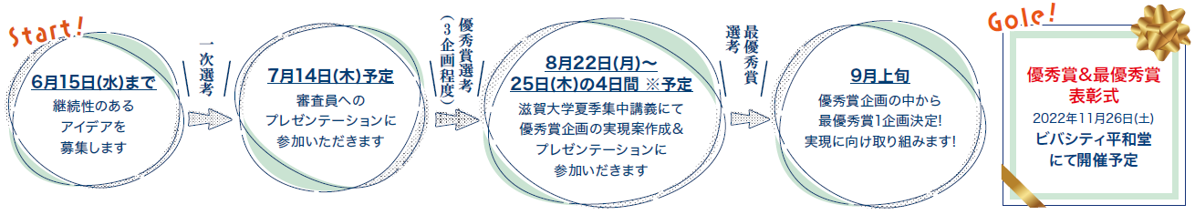 2022年は、高校生から彦根が抱える社会課題を解決できる「継続性のあるアイデア」を募集し、一次選考を通過した高校生たちによるプレゼンテーションを行います。プレゼンテーションの中から優秀賞を3企画程度選考し、滋賀大学の夏季集中講義にてアイデアを提出した高校生と大学生がチームを組み、優秀賞の「実現企画案」を作成します。その後高校生・大学生による最終プレゼンテーションにて実現企画案の中から最優秀賞を1企画決定し、実現に向けて取り組みます。
