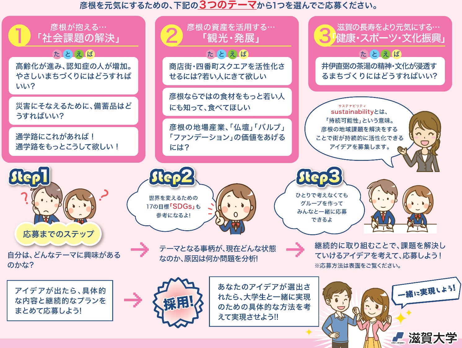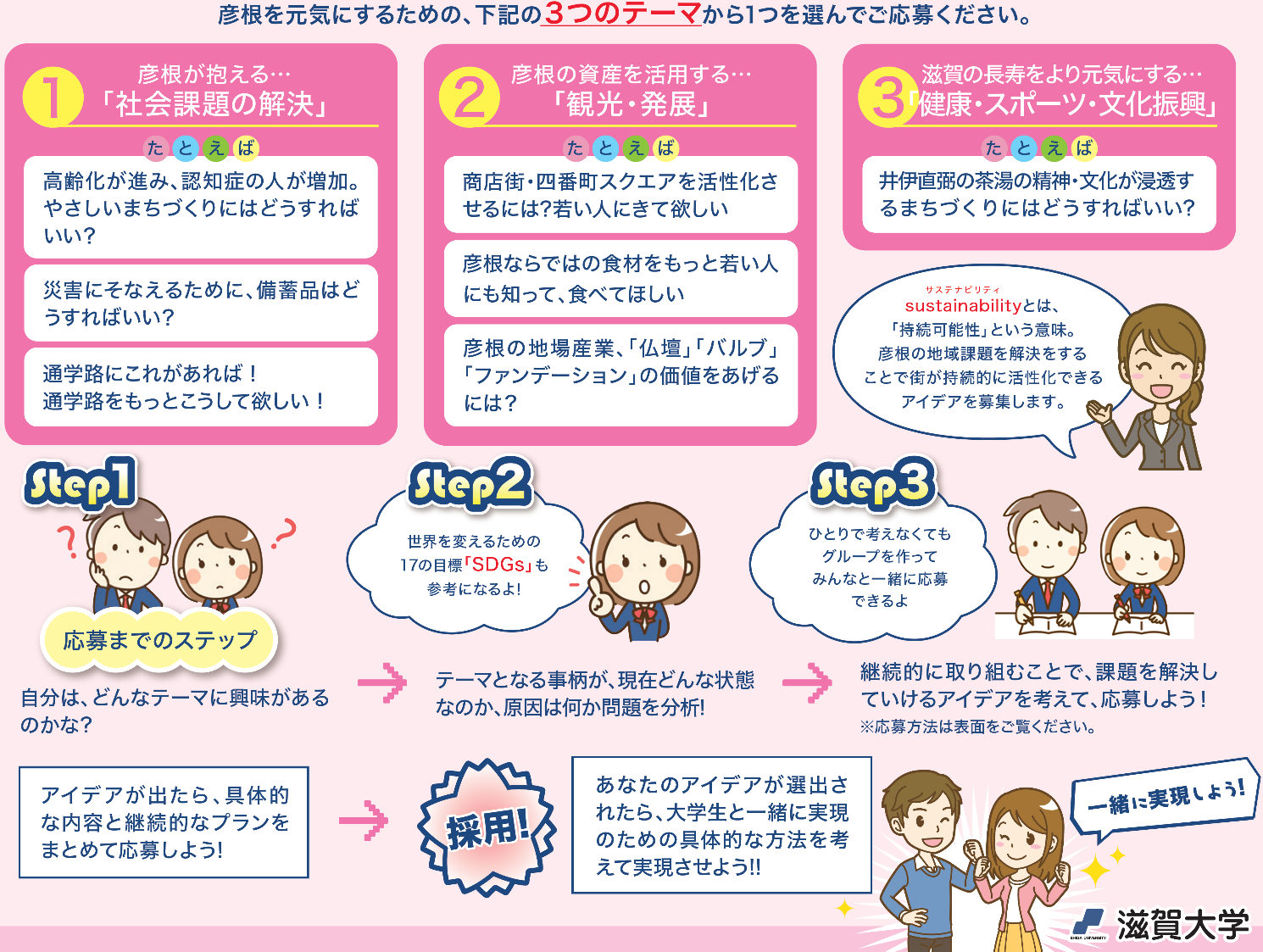 彦根の街を元気にするアイデアを募集します!「彦根の街のサスティナビリティに繋がる、地域社会、コミュニティへの貢献」として、彦根を元気にするための、下の3つのテーマから1つを選びご応募いただきます。