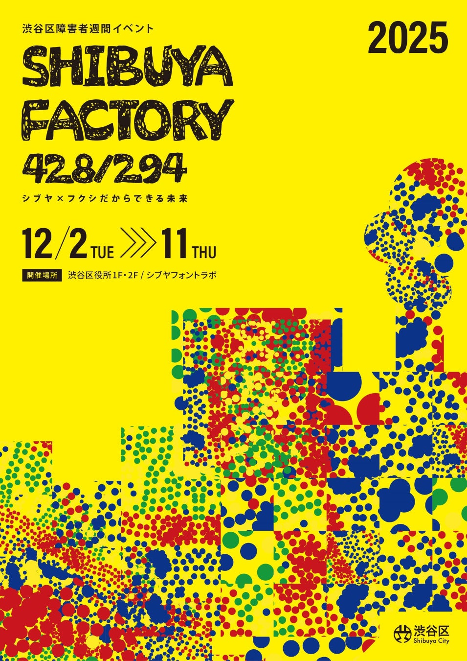 渋谷区(区長:長谷部健)と一般社団法人シブヤフォント(共同代表:磯村歩、古戸勉)は2025年12月2日(火)から12月11日(木)に「渋谷区障害者週間イベント SHIBUYA FACTORY 428/294 」を渋谷区庁舎1〜2F、東急プラザ原宿7F「シブヤフォントラボ」にて開催いたします。