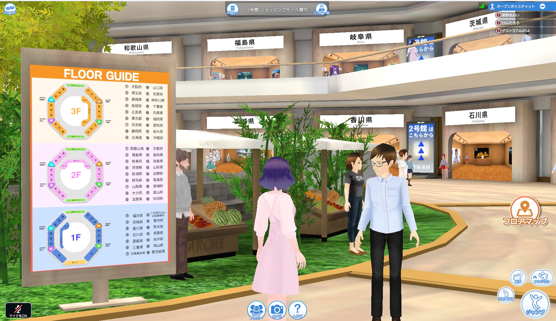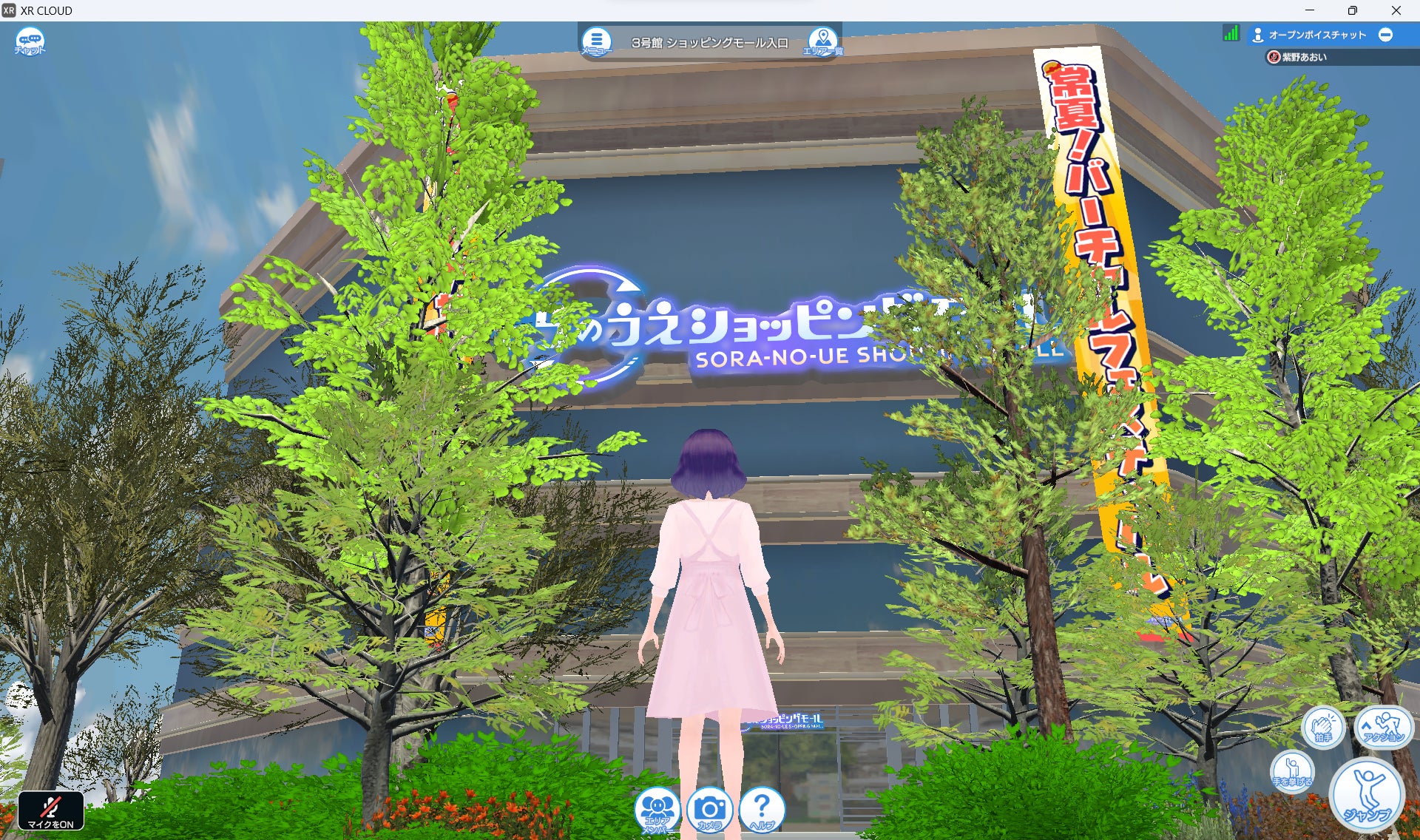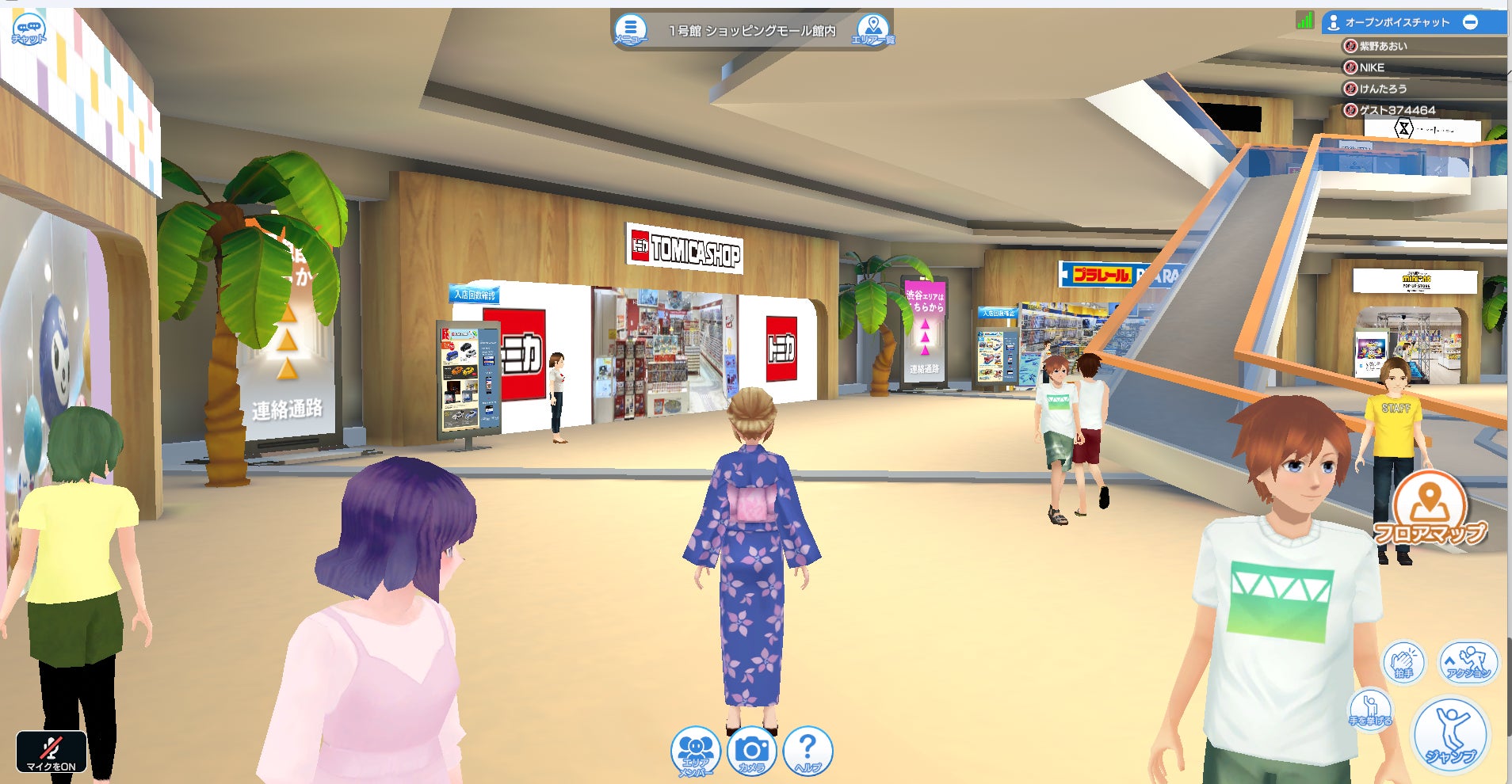 スマートフォンやパソコンから、インターネットでアバターになって、100店舗以上のショップが集積されたモールでショッピングや、音声チャットでコミュニケーションをとることもできるメタバースの商業施設です。1000人同時接続も可能で、コンサートや発表会などに利用できるイベントスペースなどもあり、現在「3号館」までオープンしています。年内には更なる増床や、新機能の実装が予定されています。
