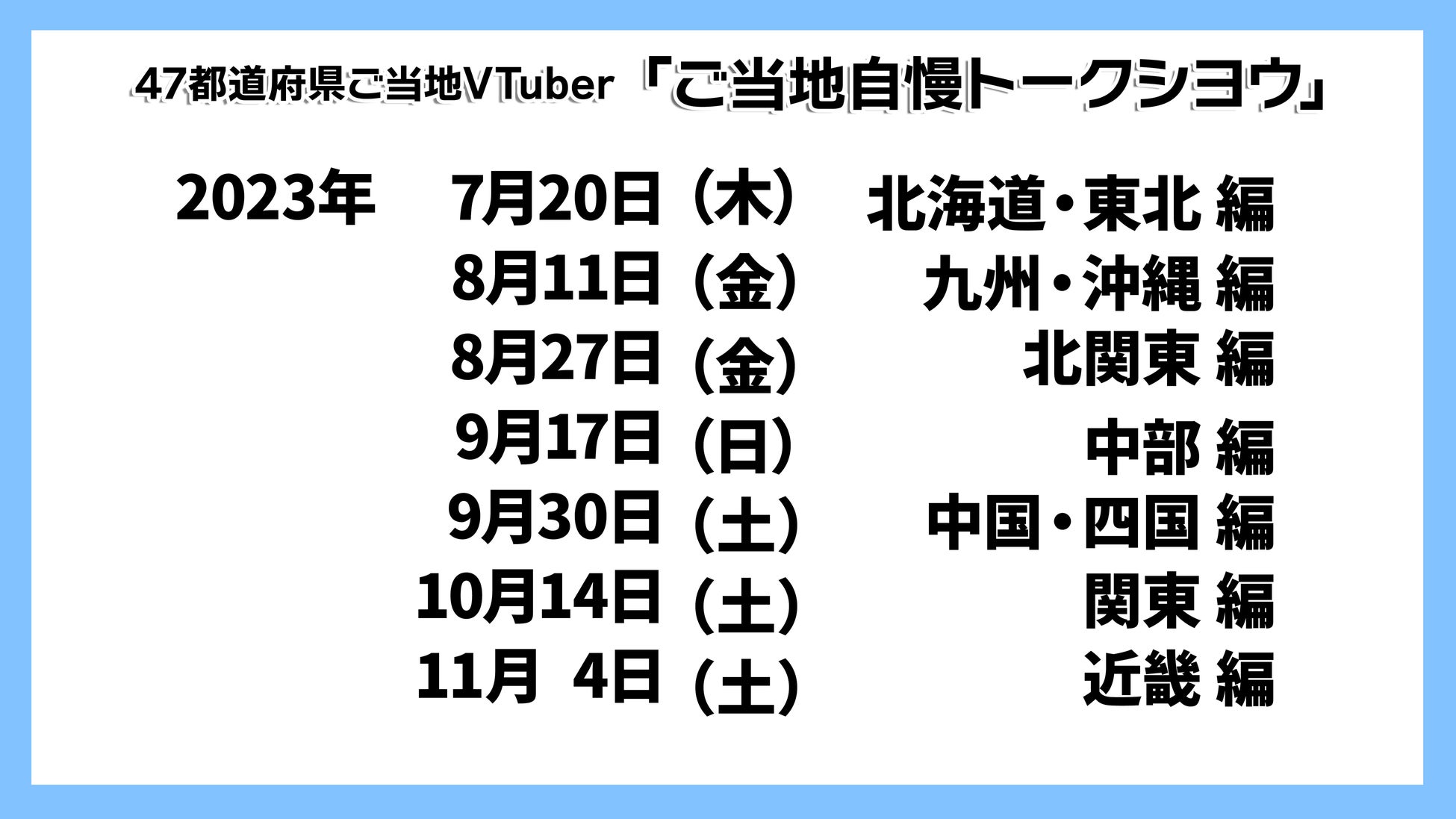 第1回は、「北海道・東北編」と銘打ち、北海道のご当地VTuber「鬼霧シアン」、青森県は「リンコナ」、福島県は「樫尾キネ」、山形県は「咲良しょこら」、秋田県は「蓮桜みこね」の5名がステージゲストとして登場し、それぞれのご当地自慢や、方言クイズ大会などを行います。