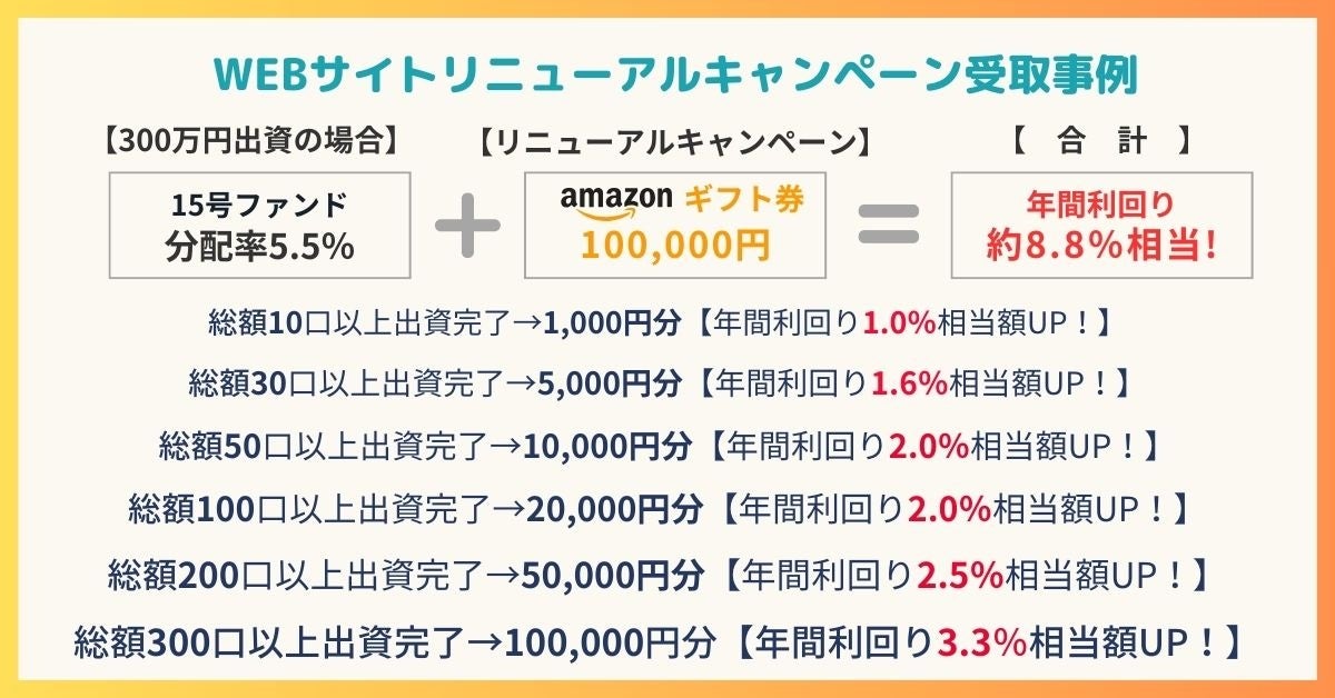 出資額が300万円以上の場合、最大で100,000円分のギフト券がもれなくゲットできます!