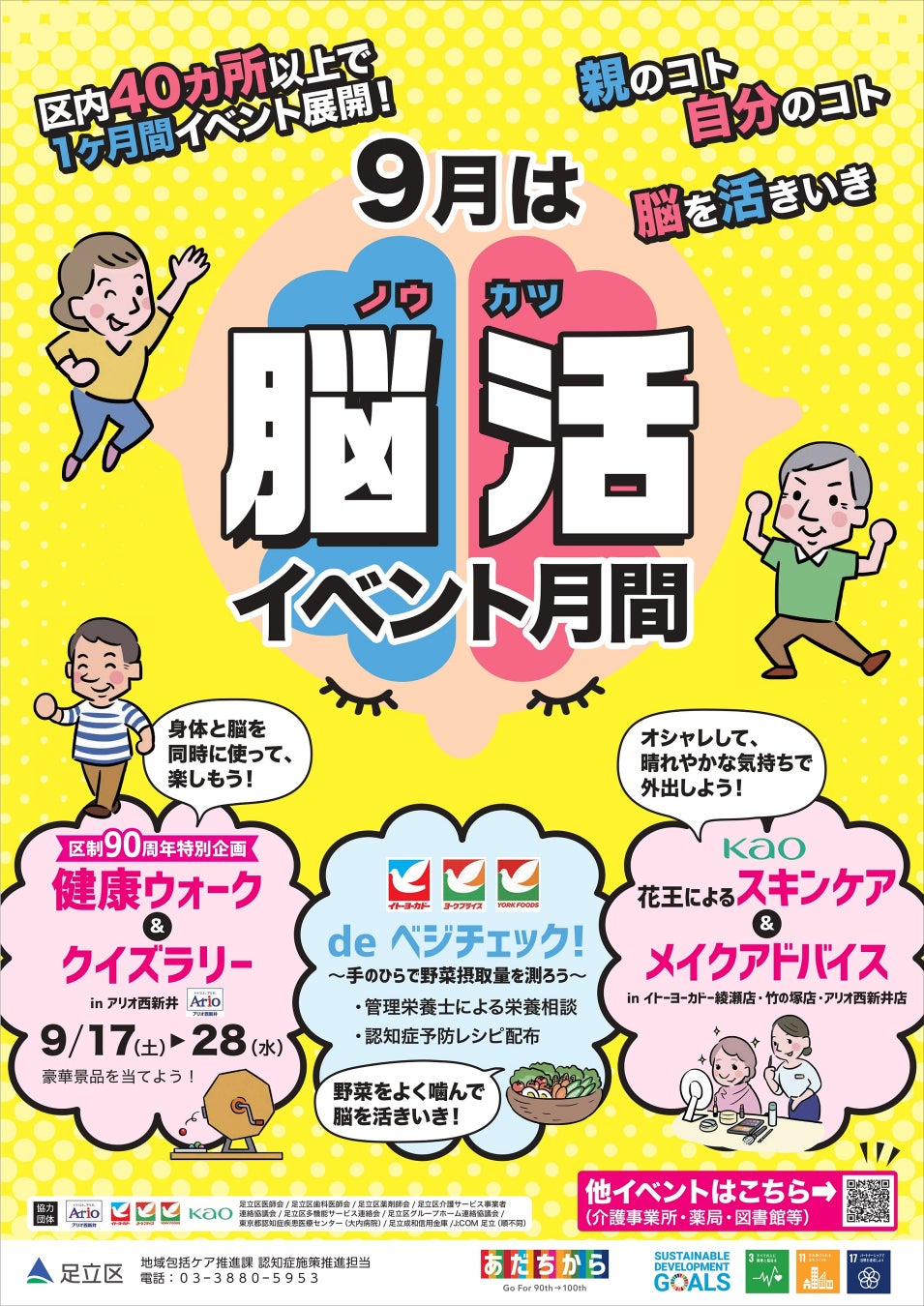 認知症月間である9月中に足立区内のスーパーマーケットや薬局、介護事業所、地域包括支援センターなど40か所以上で様々な企画を展開。また、大型商業施設アリオ西新井では、9月17日土曜日に区内随一の面積を誇る商業施設内でのウォーキングの提案や、花王マーケティング株式会社によるシニア向けのメイク講座などを行う“脳活フェスタ”を開催します。