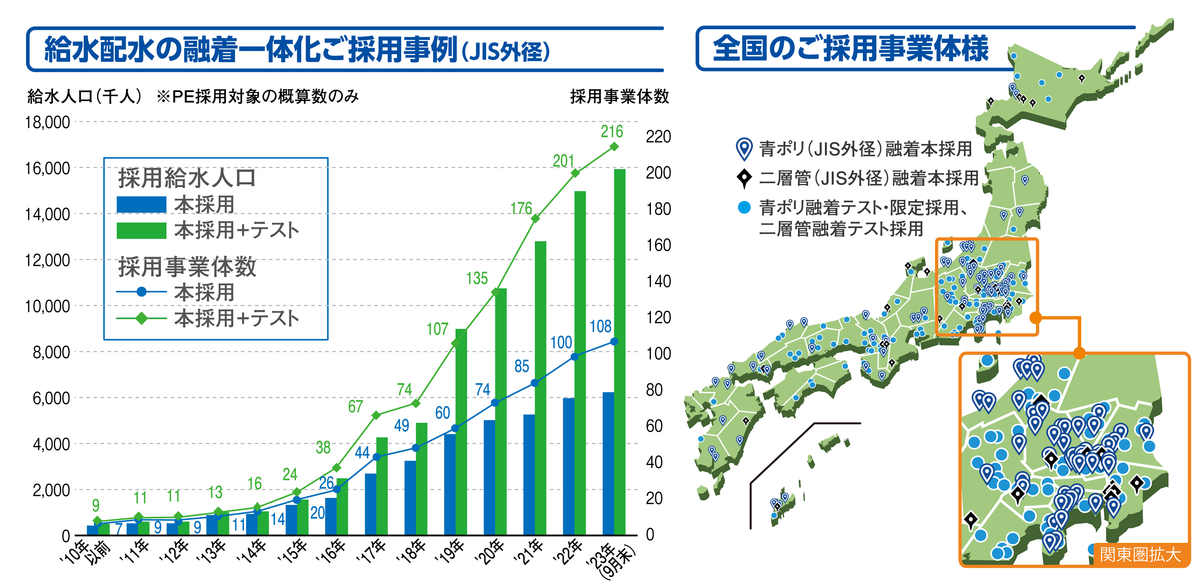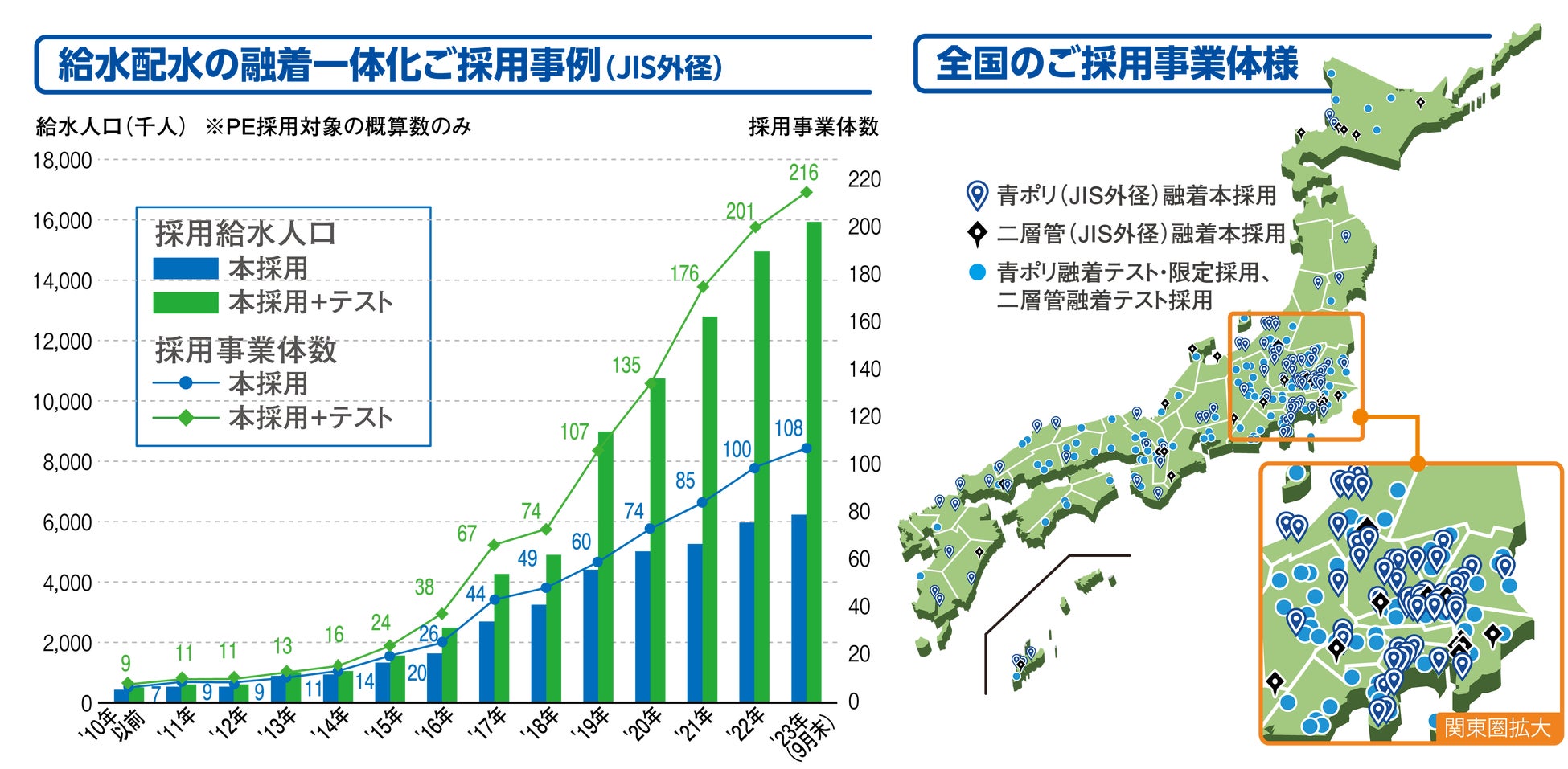 ここ5年ほどは政令指定都市、中核市での口径100mm~150mmまでの「青ポリ管」本採用が増えています。特に注目いただきたいのは、配水管のみのご採用ではないこと。「給水装置」まで管路全体を「融着による一体管路」にすることで、給水装置の耐震化・長寿命化に貢献します。
