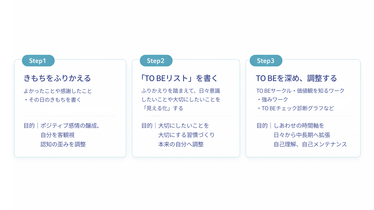TO BEサークル、価値観・強みワーク、TO BEチェック診断グラフで、しあわせの時間軸を日々から中長期へと拡張します。