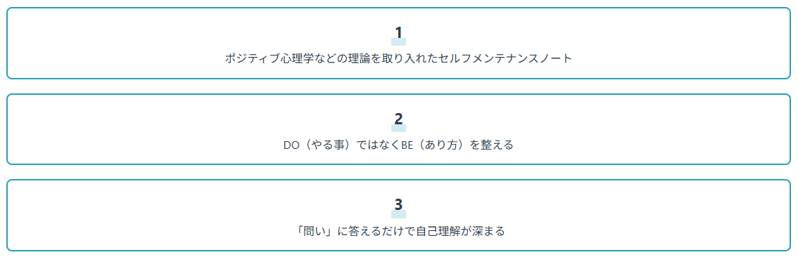 よかったことや感謝したこと、その日のきもちを書く。ポジティブ感情の醸成・自己客観視・認知の歪みの調整を促します。