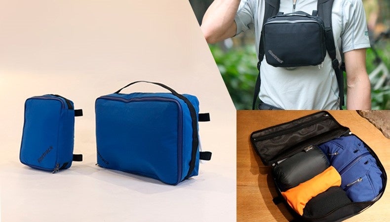バックパック内での小物・衣類等の整理はもちろん、容量拡張のための外付けポケット、単体で簡易バッグとしてなど、遊びのシーンに合わせて自由に・マルチに使っていただけます。