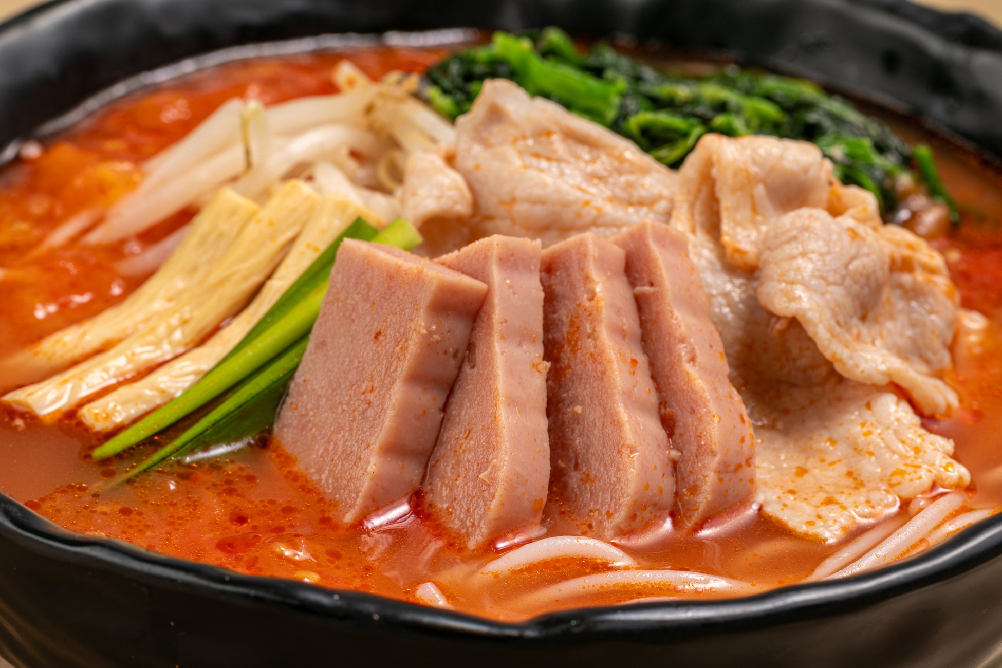 豚ロースとランチョンミートのトッピングはトマトスープと相性がよく、強すぎないまろやかなパンチのある仕上がりに。
