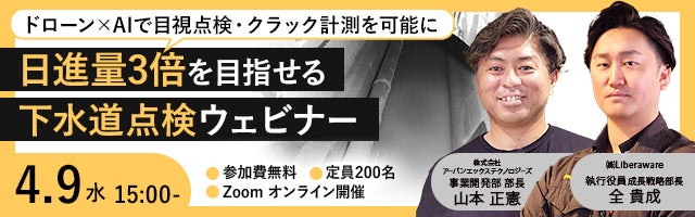 株式会社アーバンエックステクノロジーズ(本社:東京都中央区、代表取締役:前田 紘弥、以下 アーバンエックス)は、株式会社Liberaware(本社:千葉県千葉市、代表取締役 :閔弘圭)と共同で、「ドローン×AIで目視点検・クラック計測を可能に 日進量3倍を目指せる下水道点検ウェビナー」を開催します。