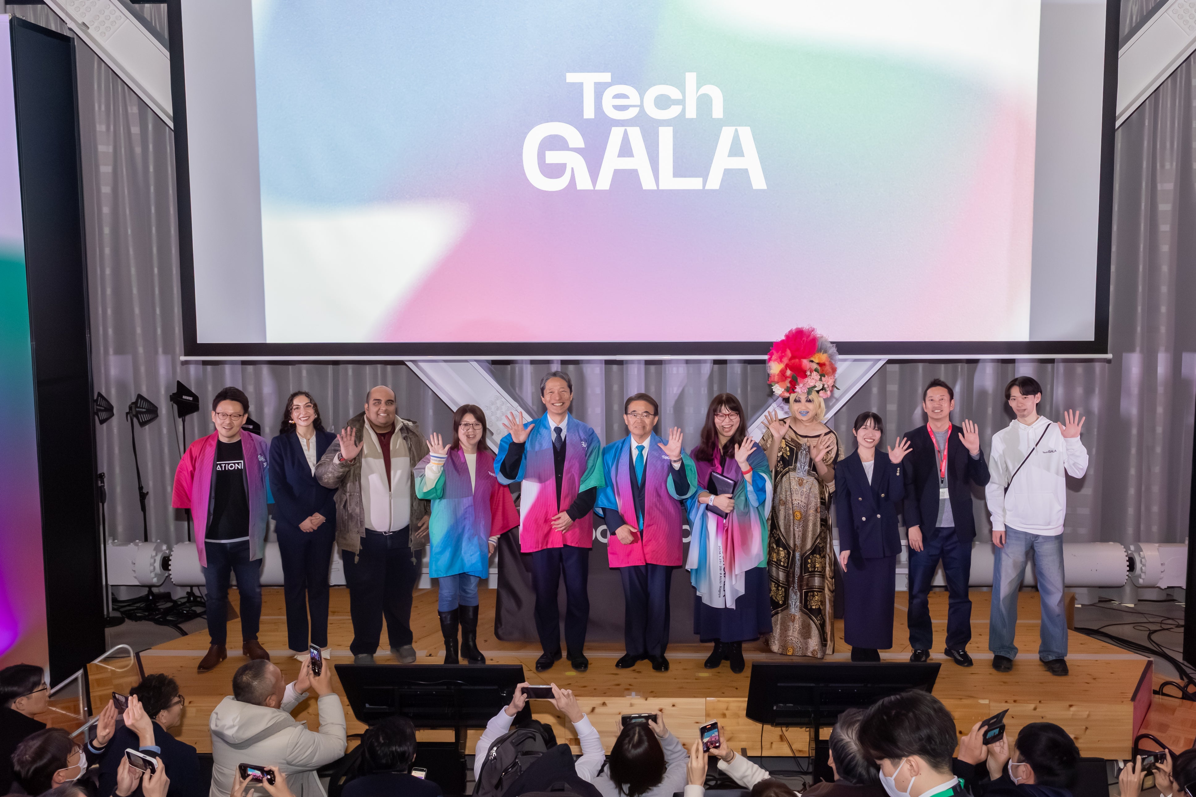 続いて、世界各国のスピーカーやボランティアなど、TechGALAを彩った多様な参加者たちが壇上に集結しました。それぞれが「国境を超えた交流」や「新たな共創の可能性」について語り、会場は温かな一体感に包まれました。