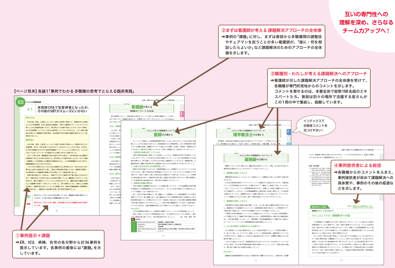 ■各論1「事例でわかる 多職種の思考でとらえる臨床実践」(p.25~266)では、ER、ICU、病棟、在宅の各分野からチームアプローチが必要な事例を取り上げ、その事例ごとに課題に対して、各職種の臨床家がチームアプローチの視点に立った見解を示します(下図)。