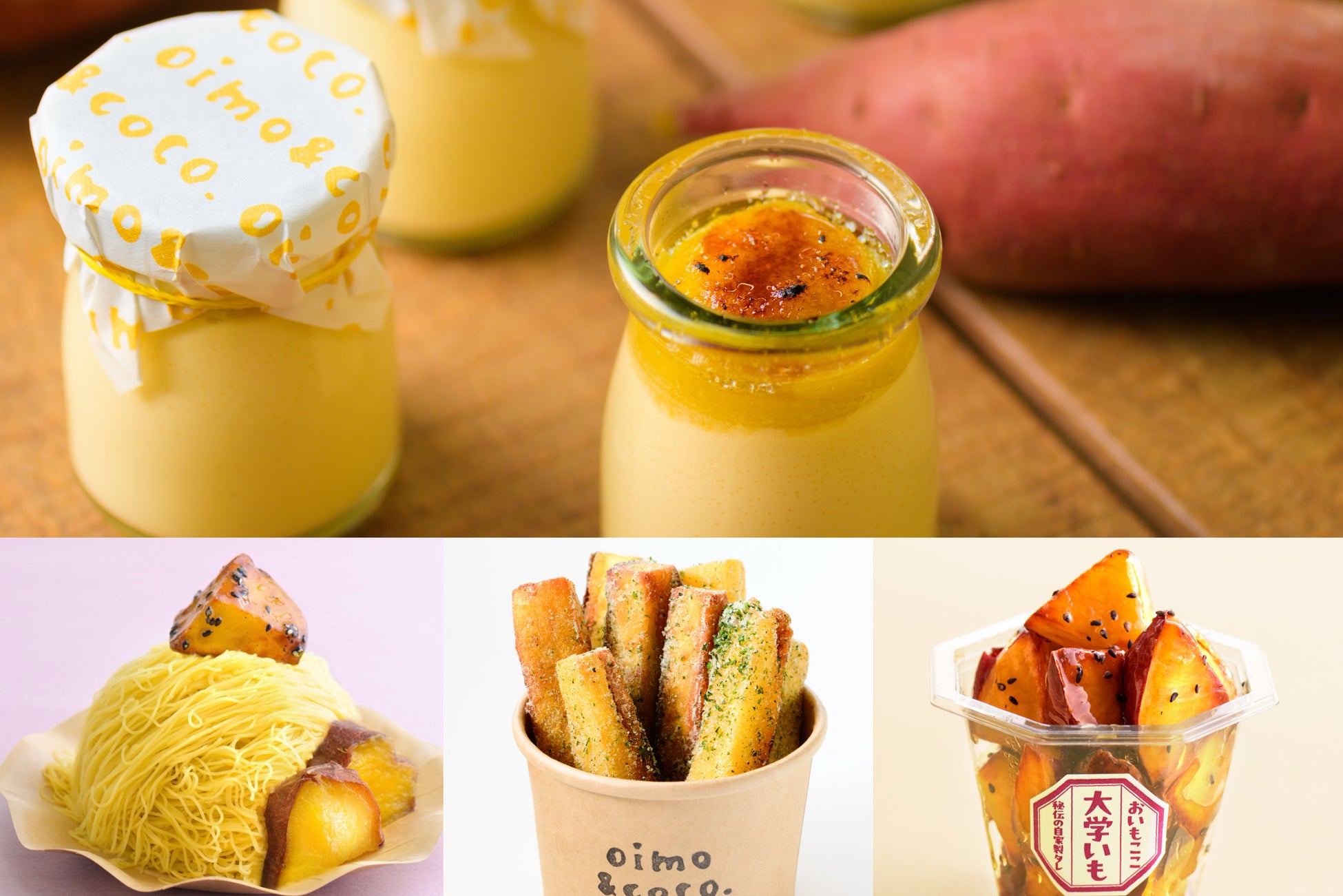 素材そのままの焼き芋になによりもこだわりつつ、高品質のさつまいもを使用したスイートポテトや焼き芋プリン、焼き芋モンブラン、大学芋、焼き芋スティックフライなど、多彩なさつまいもスイーツを展開していることも「oimo&coco.」の魅力のひとつです。