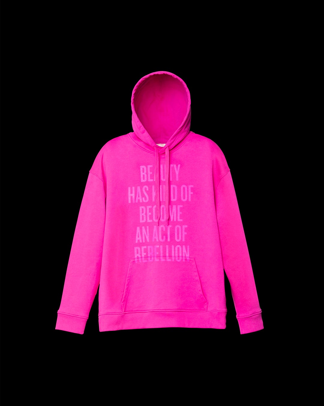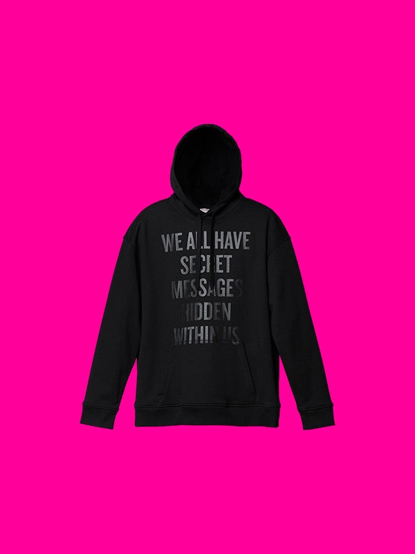 最新のクープランドとのコラボレーションによるカプセルコレクションでは、トーンオントーンのプリントが施されたコットンスウェットフーディーとTシャツが、ピンクPPカラーとブラックの2色で登場します。それぞれのウェアには、4つの異なるメッセージがあしらわれています。