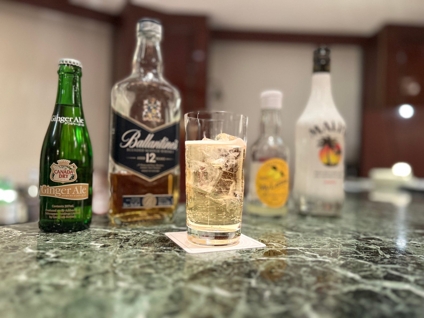 バランタインのブレンデットスコッチウイスキーとココナッツ・リキュールが織りなす甘みとジンジャーエールの爽快感を楽しめるロングカクテル。