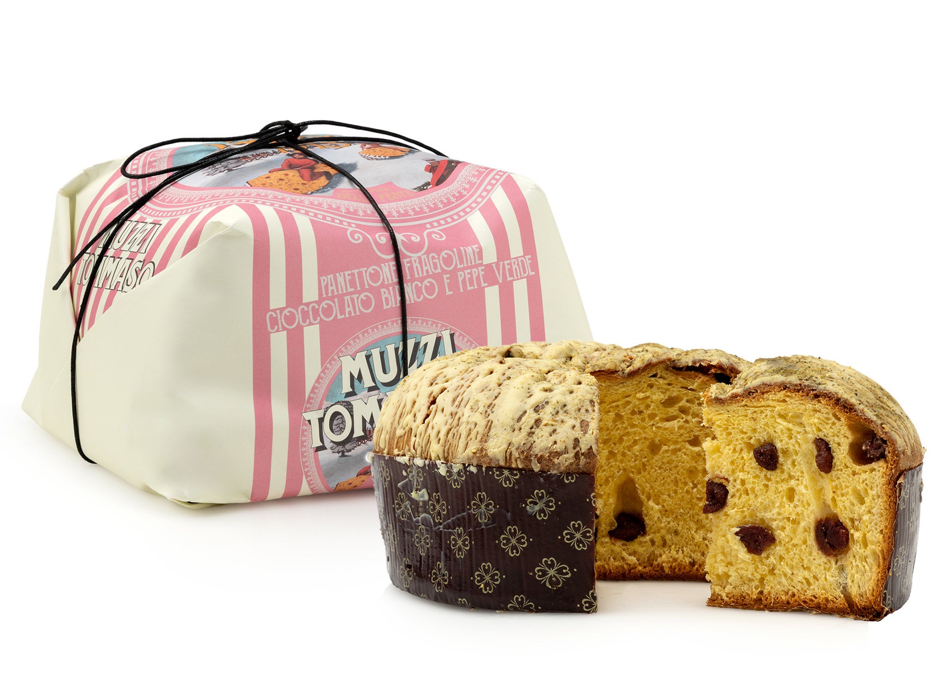 ノイチゴの甘酸っぱいフィリングとホワイトチョコレートをプラスした豊かな味わいのパネットーネ。仕上げに挽いたグリーンペッパーをふって風味と香りのアクセントにしています。