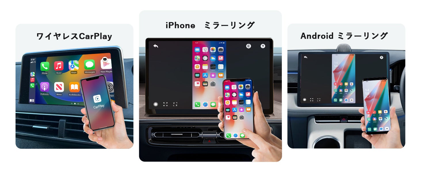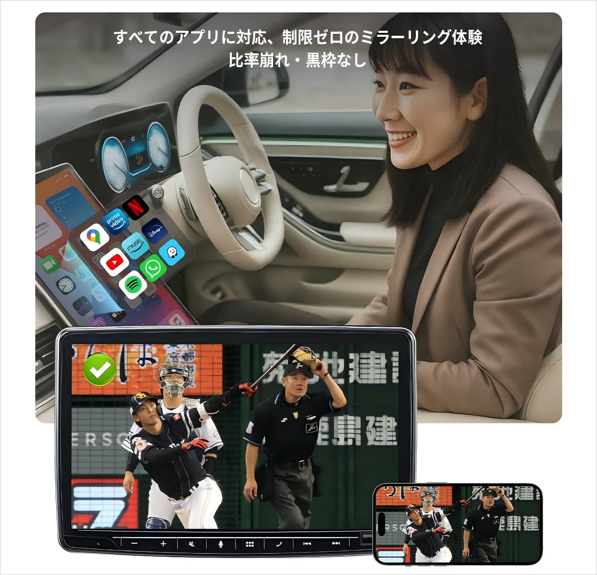 スマホの画面を車の純正ディスプレイにワイヤレスで映し出すだけでなく、ナビ画面から直接スマホ操作までできる、次世代のミラーリングアダプターです。YouTube、Netflix、Googleマップ、LINE、TikTokなど、お気に入りのアプリを車内でスムーズに操作・再生できます。