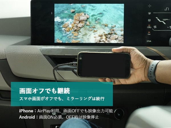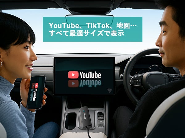 スマホの画面をそのまま車載ディスプレイに映して、YouTubeやTikTok、Googleマップなどを最適サイズで表示。