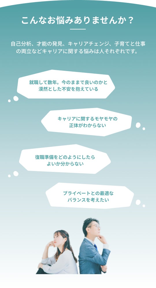 キャリア支援の専門家が、あなたのキャリアに関する悩みをお聞きし、あなた自身がありたい姿に近づけるよう支援をしていきます。