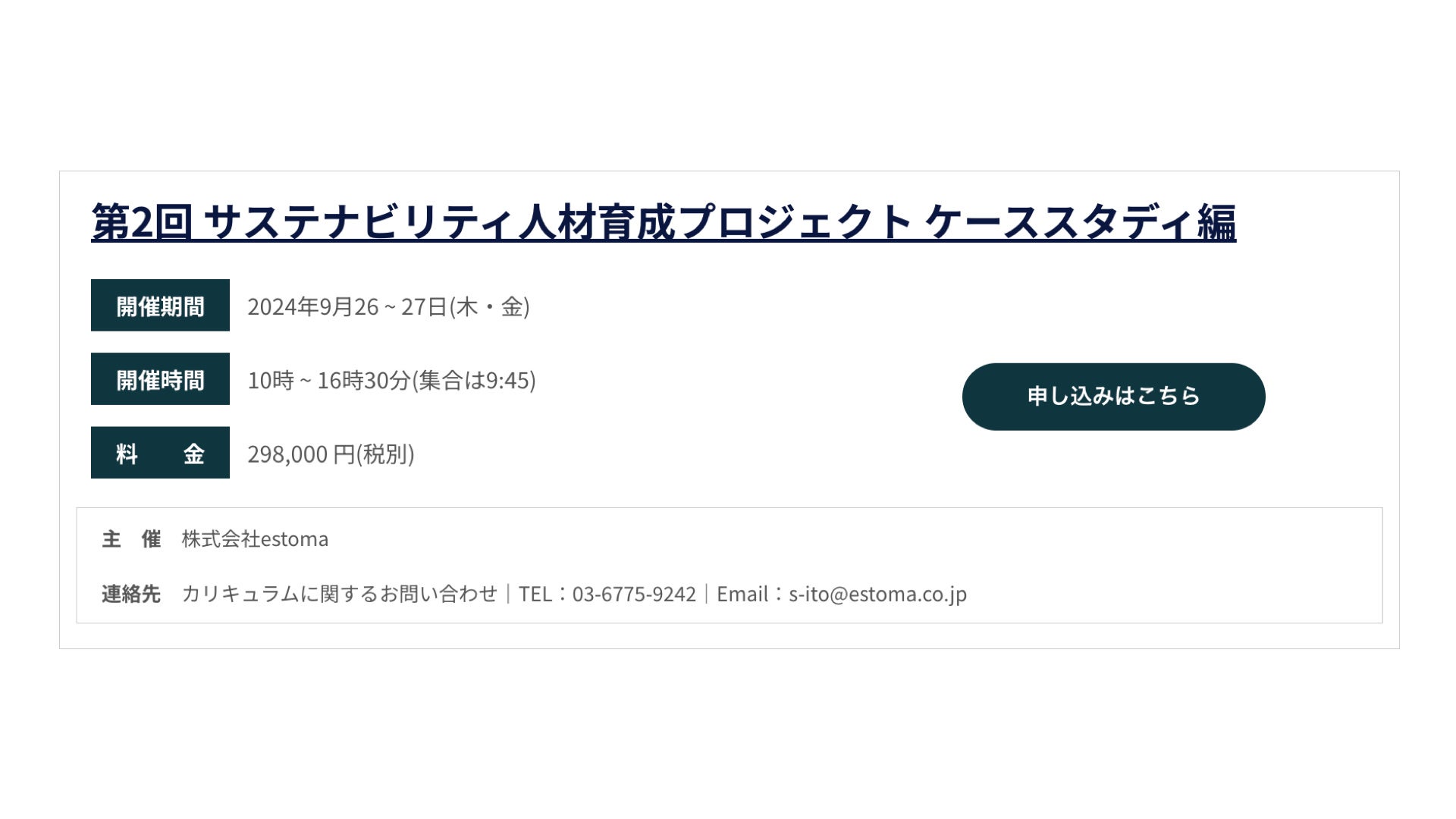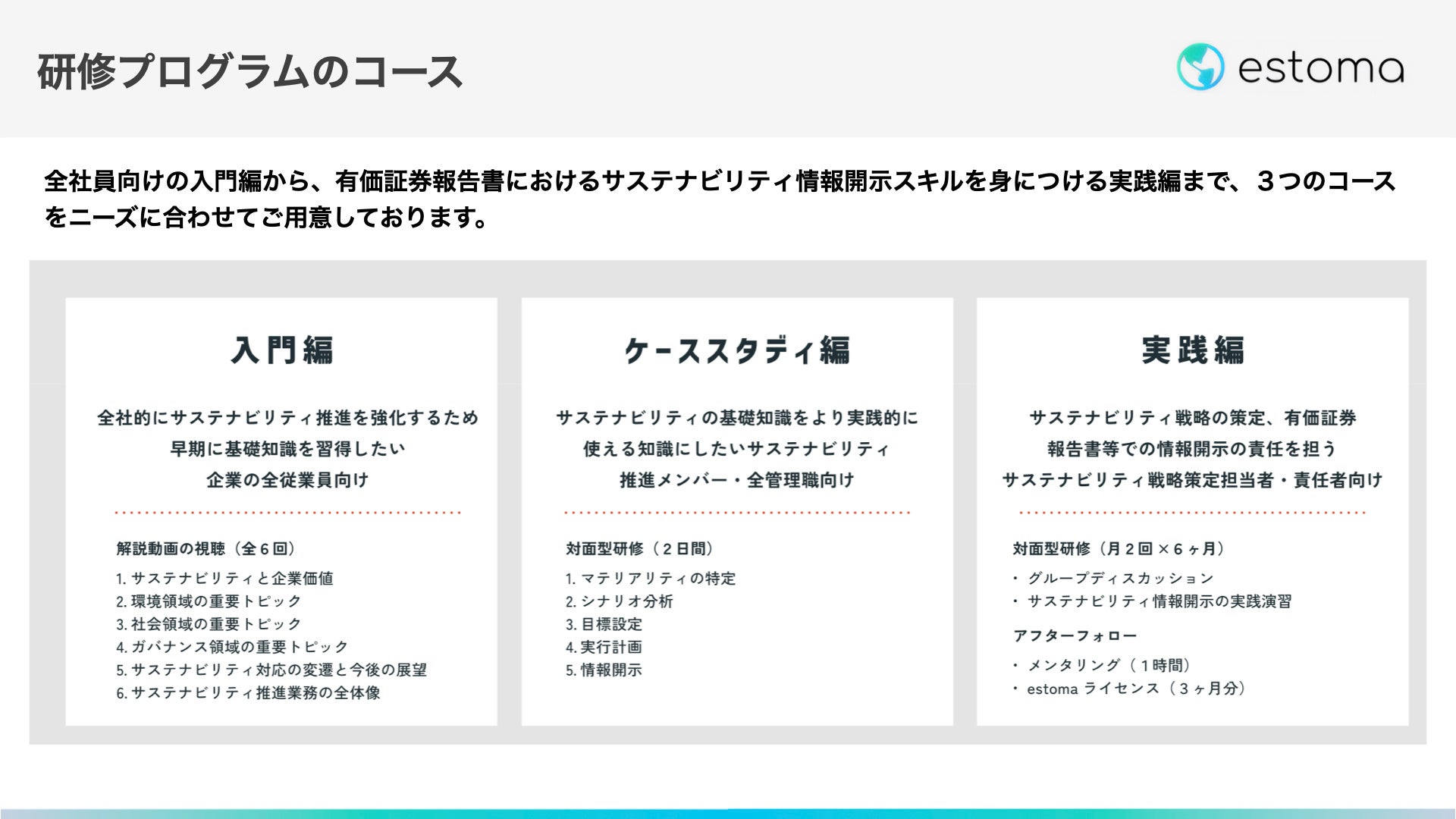 株式会社estoma(本社:東京都中央区、代表取締役:伊藤総一郎)は、サステナビリティ人材を短期間で育成する「サステナビリティ人材育成プログラム」のカリキュラムと事例レポートを公開しました。