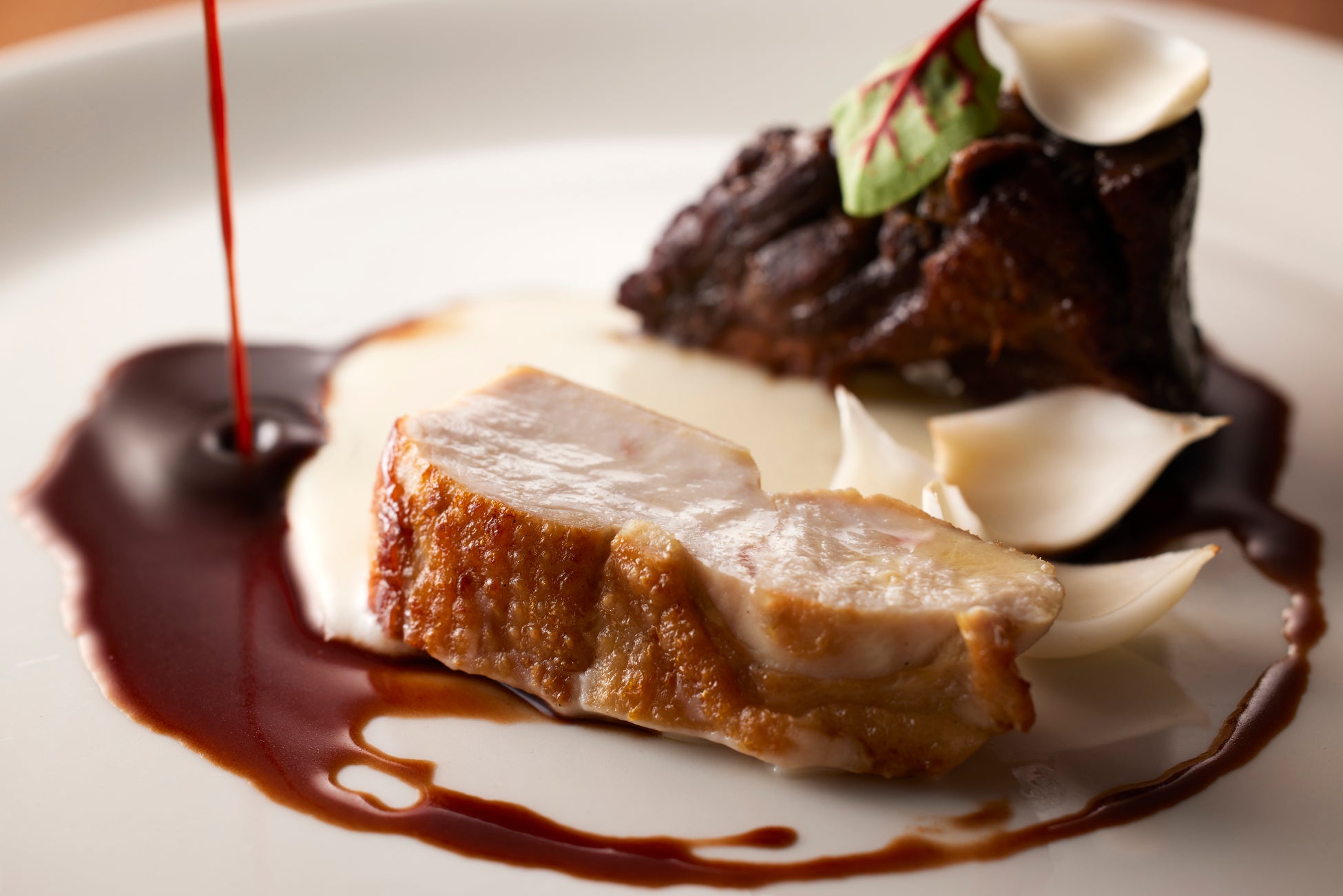 メインダイニング「TROFEO イタリアン」では、オープンキッチンで調理されるダイナミックな雰囲気の中、華やかなクリスマスディナーをご提供いたします。静岡県産の豊かな食材が織りなすメニューには、富士山御殿どりと鴨の濃厚なテリーヌや、香り高いポルチーニと冬牛蒡を贅沢に使った御殿場コシヒカリのリゾットが並び、地元の味覚がイタリアンとして見事に昇華されています。選べるメイン料理には、じっくりと火入れした駿河軍鶏のローストを、百合根のピュレとマルサラワインソースでご提供。こちらは、駿河軍鶏の煮込みも添えられ、異なる食感と味わいをお楽しみいただけます。もう一方のメインは、静岡の特産品・金目鯛を香ばしくグリルし、凝縮された旨味を引き出した漁師風スープ仕立てでご提供いたします。旬の芽キャベツやムール貝を添え、海の恵みが詰まった贅沢な味わいをご堪能ください。