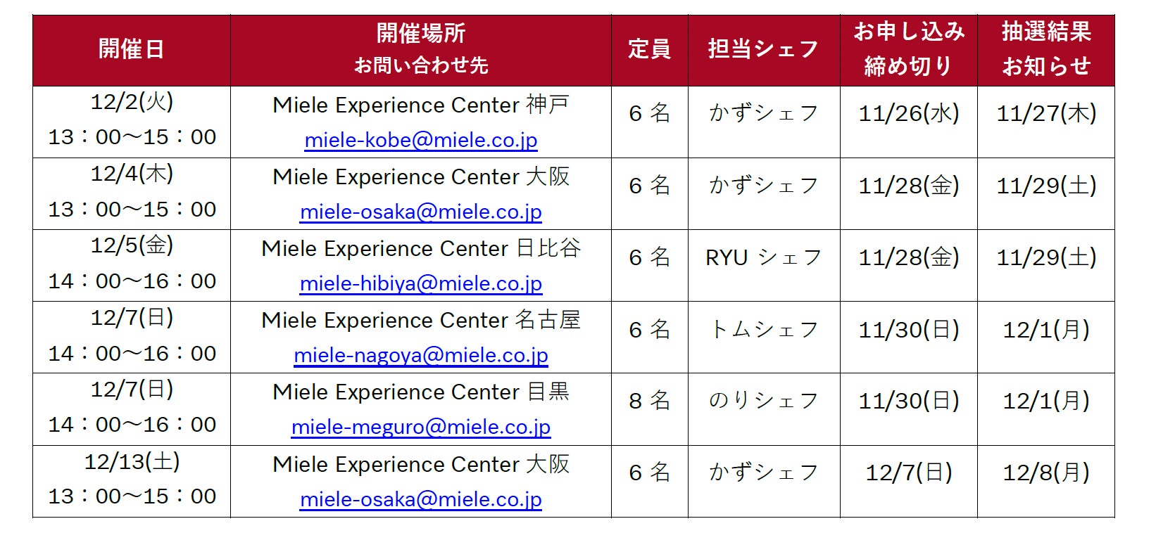 当イベントは、表参道店が各回16名、目黒店が8名、日比谷・名古屋・大阪・神戸の店舗では各回6名の定員で実施予定となっており、本日11月14日(金)より、Miele公式サイト内の専用ページで参加申込の受付を開始いたします。(※定員を超える場合は抽選となります。期間内で、店舗によってイベントの実施日や内容が異なりますので、申込締め切りや当選者発表のスケジュールと合わせて詳細は次頁以降またはお申し込みページをご参照ください。)