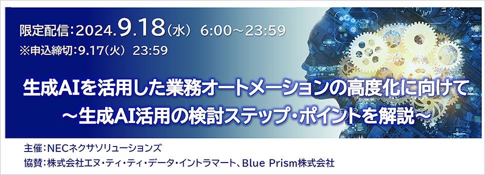 NECネクサソリューションズは、「生成AIを活用した業務オートメーションの高度化に向けて」セミナーを9月18日(水)にオンデマンド配信します。お申し込みは9月17日(火)まで受け付けています。