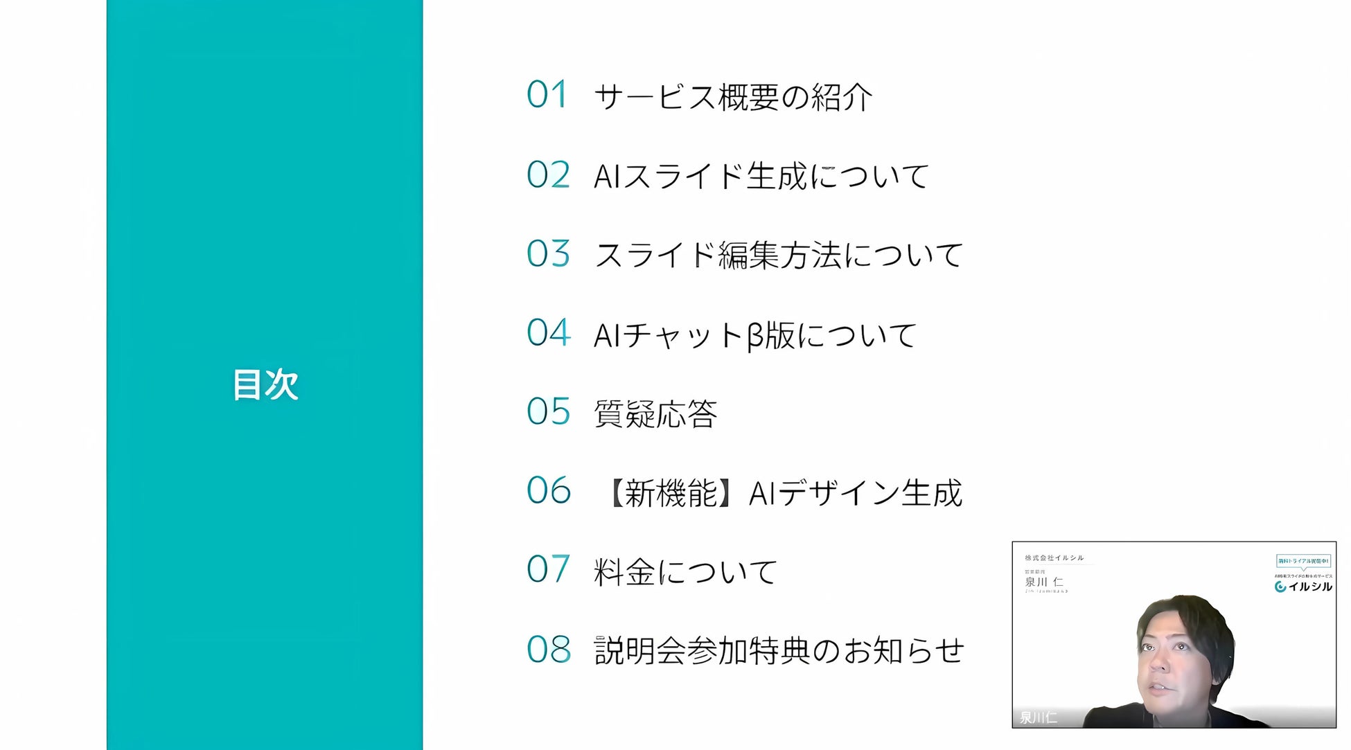 株式会社イルシル(本社:東京都渋谷区、代表取締役:宮﨑有貴)は、当社が開発・提供するAI搭載スライド自動生成サービス「イルシル」に関する法人向け説明会を開催し、1,700社以上の企業・団体にご参加いただきました。本説明会では、「イルシル」の機能概要に加え、業務効率の向上やスライド資料作成時間の大幅な短縮といった導入効果が具体的に示され、多くの参加企業より高い評価をいただきました。今後も当社は、説明会を通じて得られた声をもとに、さらなるサービスの改善とサポート体制の強化を進めてまいります。「イルシル」は、スライド資料作成の効率化を超えて"コミュニケーション"そのものを簡単に、わかりやすくすることを目指し、AI時代における新たなスライド資料作成のスタンダードを目指してまいります。