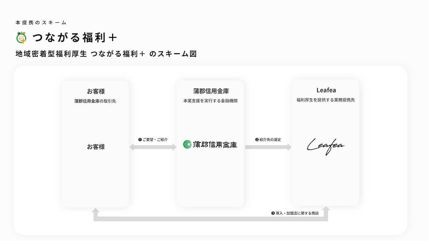 地域密着型福利厚生サービスを提供する株式会社Leafea(本社:東京都中央区、代表取締役:森田 渉、以下リーフィ)は、蒲郡信用金庫(本店:愛知県蒲郡市、理事長:岡本 聡哉)と提携を開始します。11/20(木)より蒲郡信用金庫で地域密着型福利厚生サービス「つながる福利+(プラス)」の取扱いを開始し、地域創生と日々頑張る方の支援を目指します。