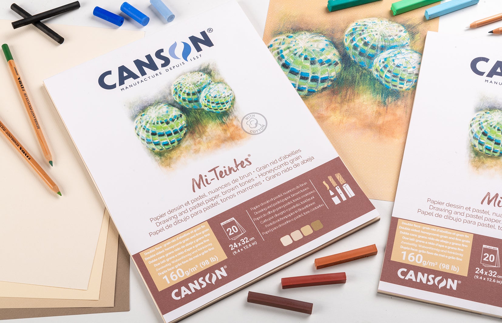 「ミ・タント」は、フランスの名門製紙メーカー、Canson(キャンソン)社が製造する、主にパステル画用として愛されてきた世界の名門紙です。原料にコットンを含んでいるため、やわらかな風合いを持ちながらも、強くこすっても紙剥けしない強さや、芯のある紙の硬さが特長です。紙の表面はハニカム状(ハチの巣状)の凹凸があり、描画でのグラデーションをきれいに表現できます。全50色の豊富なカラーラインアップを取り揃えており、インクジェットプリンターでの印刷適性も高いため、幅広い作品を作り出すことができます。