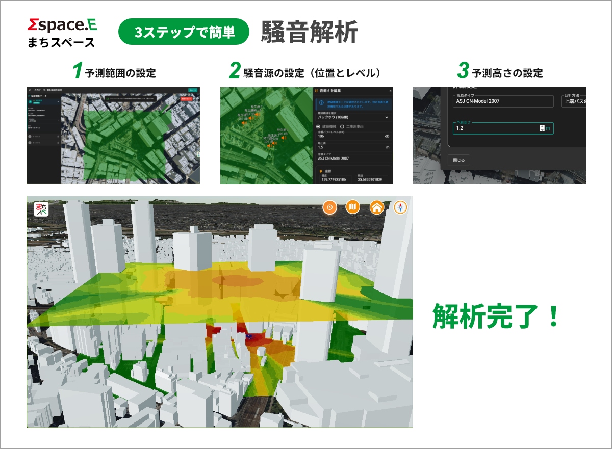 ①予測範囲の設定、②騒音源の設定(位置とレベル)、③予測高さの設定の3ステップで、物理式に基づく騒音予測を行い、その結果をまちスペースの3D都市モデル上で可視化できます。AIによる推定ではなく、物理式に基づく計算を行うため、精度の高い結果を手軽に得られます。