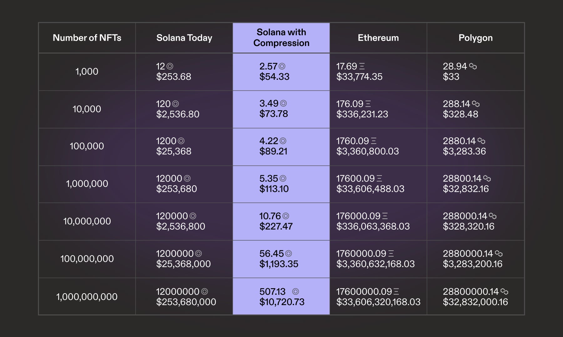 (参考記事)State compression brings down cost of minting 1 million NFTs on Solana to ~$110: https://solana.com/news/state-compression-compressed-nfts-solana