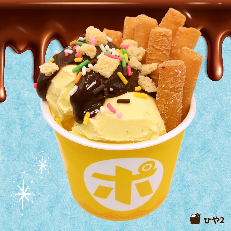 濃厚なバニラアイスクリームに「チョコレートソース」や「キャラメルソース」をかけた2種類のフレーバー。
