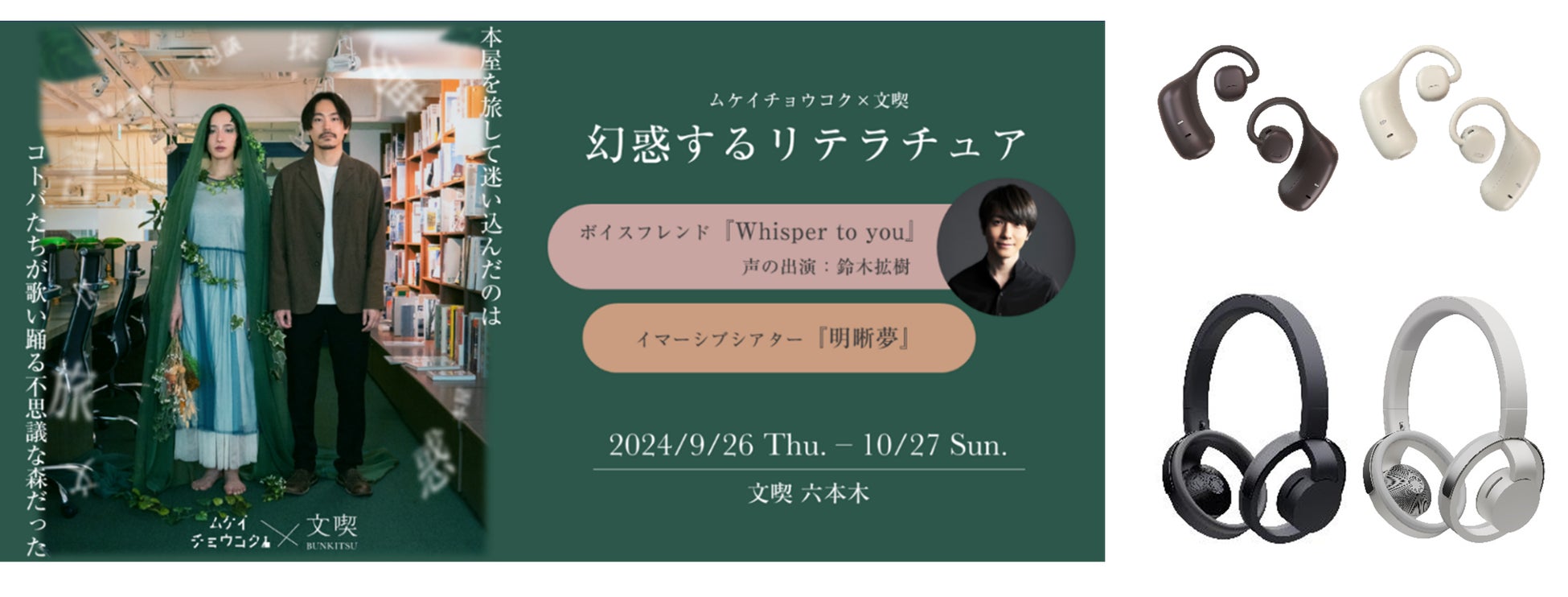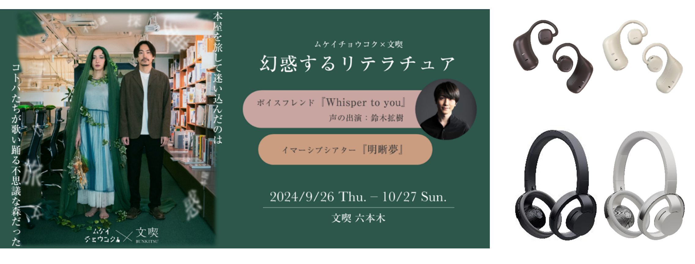 このたび、2024年9月26日(木)から10月27日(日)まで「文喫 六本木」で開催される、イマーシブシアター団体「ムケイチョウコク」との初コラボによるボイスフレンド『Whisper to you』の音響デバイスとして、nwmのオープンイヤー型完全ワイヤレス耳スピーカー「nwm MBE001」およびオープンイヤー型オーバーヘッド耳スピーカー「nwm ONE」の提供が決定いたしました。また、期間中は店頭で対象製品を販売いたします。