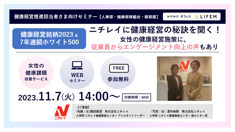 【11月7日14:00~】LIFEM 主催の企業向け無料オンラインセミナー「ニチレイに健康経営の秘訣を聞く!女性の健康経営施策に、従業員からエンゲージメント向上の声もあり」を開催